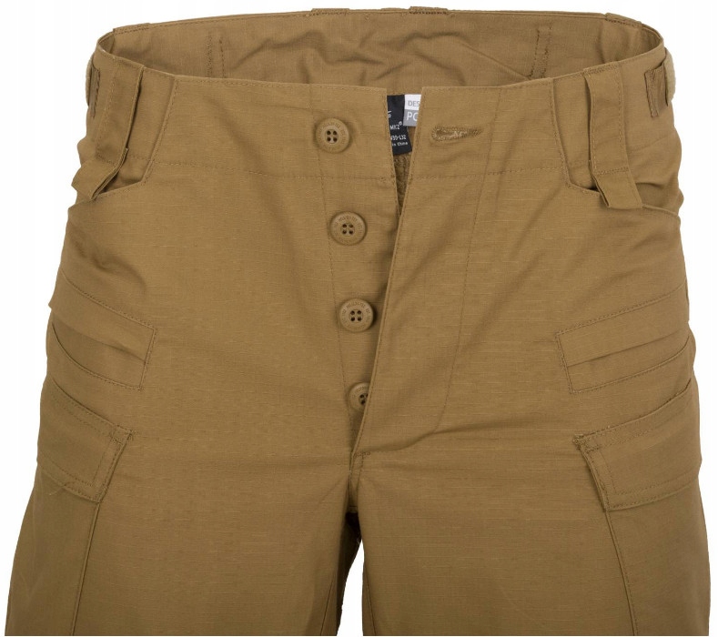 Крім регуляторів талії, штани не мають жодних металевих елементів - вони застібаються на кнопки, які також застібають шліф. Згадані регулятори шнурків дозволяють регулювати окружність талії без необхідності надягати пояс. Передні петлі для ременя з петлями спереду дозволяють прикріпити додаткове обладнання, напр. тактичний шнурок.