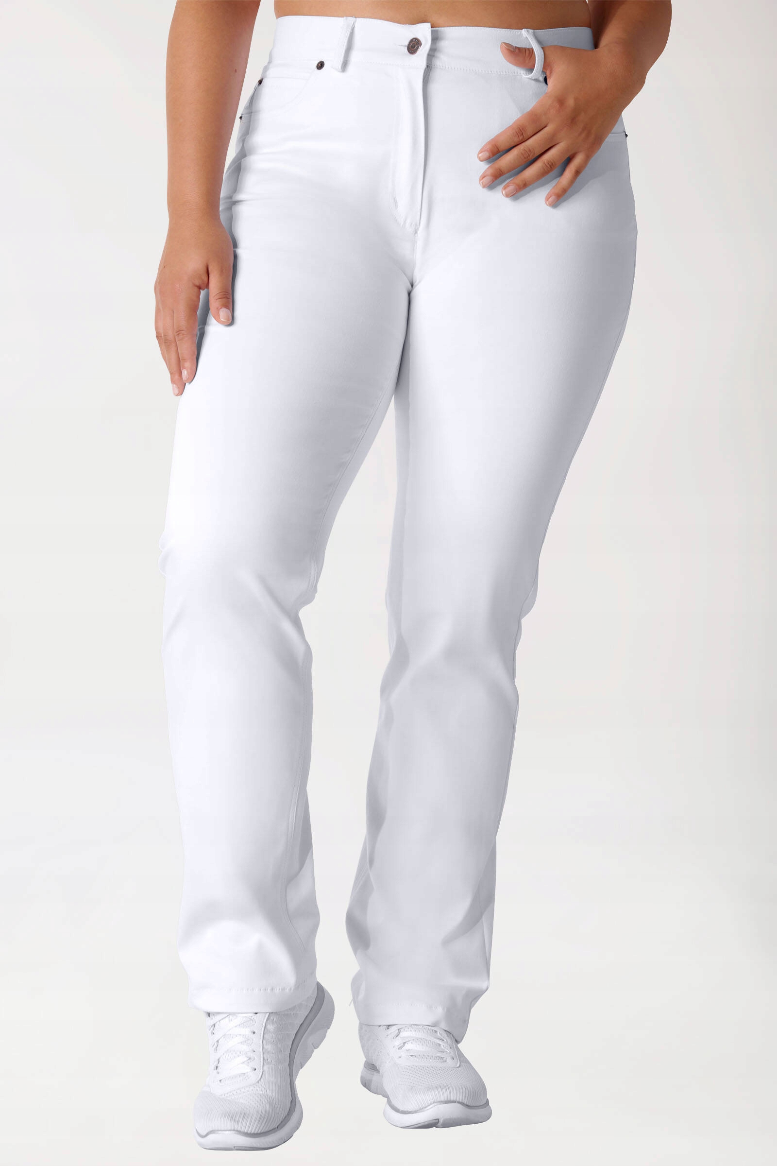 Ці жіночі стрейч-штани з високою талією та класичним дизайном із 5 кишенями створюють спортивний і повсякденний вигляд. З гігієнічної точки зору ці прямі брюки – справжній хіт: їх можна прати при температурі до 60°C, а також придатні для промислового прання. Примітка: через крій і дуже еластичний матеріал ці штани трохи більші, ніж ви звикли, якщо вони не призначені спеціально для людей з пишними формами.