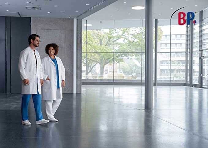 Білі штани BP білого кольору. Штани дуже зручні, мають бічні кишені. Вони виготовлені з тканини зі структурою 65% поліестеру та 35% бавовни. Ця тканина виготовлена з дуже якісних волокон. З нього можна виготовляти одяг, призначений для промислового прання. Забезпечує дуже хороший захист і комфорт використання. Одяг BP поєднує в собі універсальність із функціональністю та може використовуватися як у медицині, так і в гастрономії.