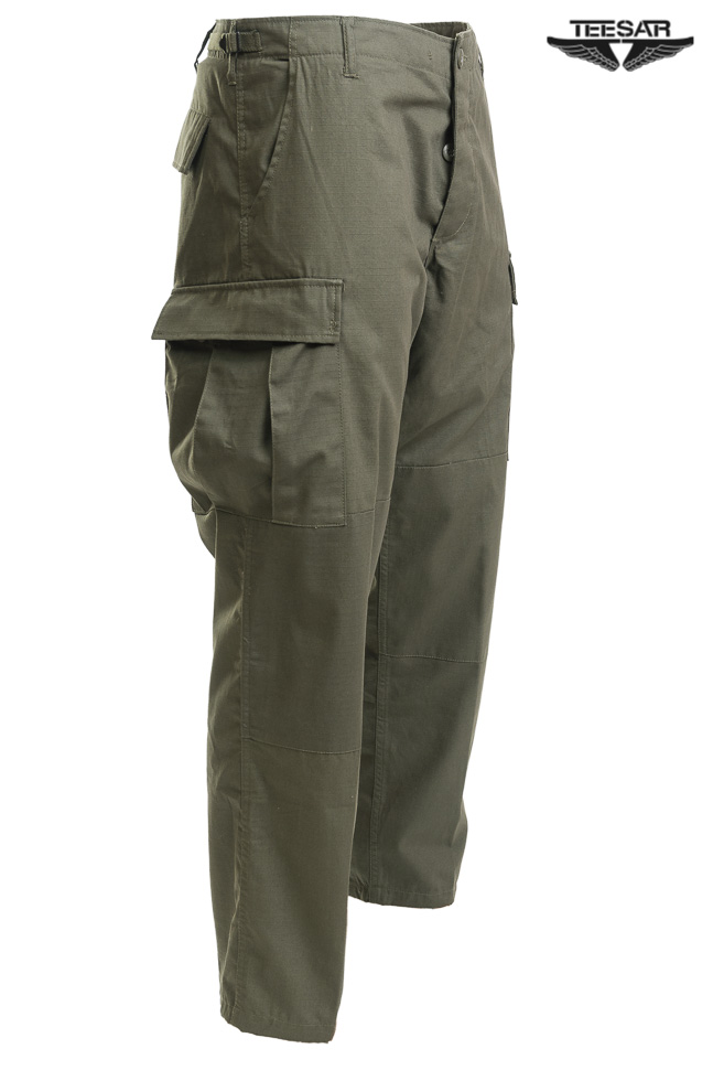 Вироблено американською компанією Teesar, INC - Cartesville, GA. Вони характеризуються чудовим універсальним кроєм, довговічністю, зручністю та хорошим виконанням. Виготовлений з легкого та повітряного матеріалу, укріпленого нейлоновою сіткою Rip-Stop (100% бавовна). Мають шість кишень, дві класичні, дві задні та дві бічні кишені підвищеної вантажопідйомності (тип CARGO). І задні, і бічні кишені закриваються клапанами на кнопках. Міцний матеріал і додаткові шви в критичних місцях гарантують довговічність. Посилені коліна та сидіння другим шаром матеріалу. Двосторонні стрічки для швидкого регулювання обхвату талії дозволяють підігнати штани під різні силуети. Унизу є регульований шнурок, який дозволяє одягати штани на взуття або всередині нього.
