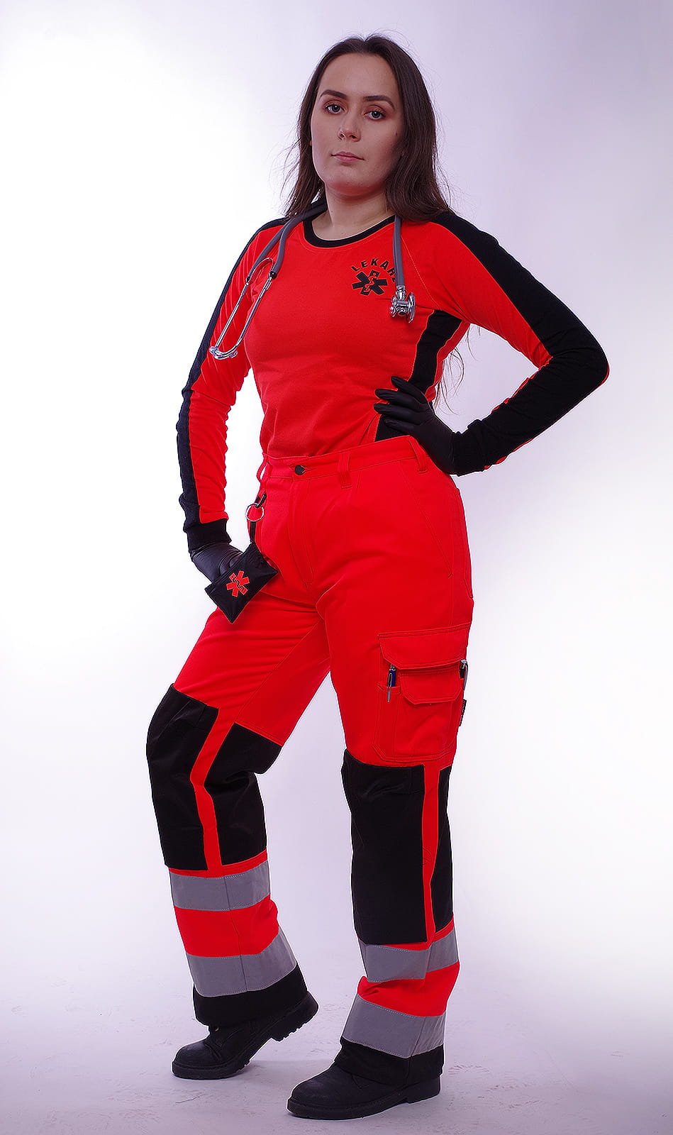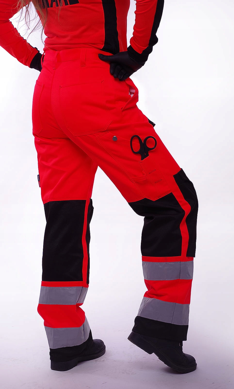 Довговічні шведські світловідбиваючі рятувальні штани, стійкі до бруду, масла та маслянистих рідин Fristads Kansas. Флуоресцентні – забезпечують максимальну видимість. Штани FLUORESCENT червоного кольору з чорною обробкою, відповідно до розпорядження міністра охорони здоров'я 18 жовтня 2010 року щодо найменування системи ДСНС та форменого одягу членів бригад екстреної медичної допомоги.