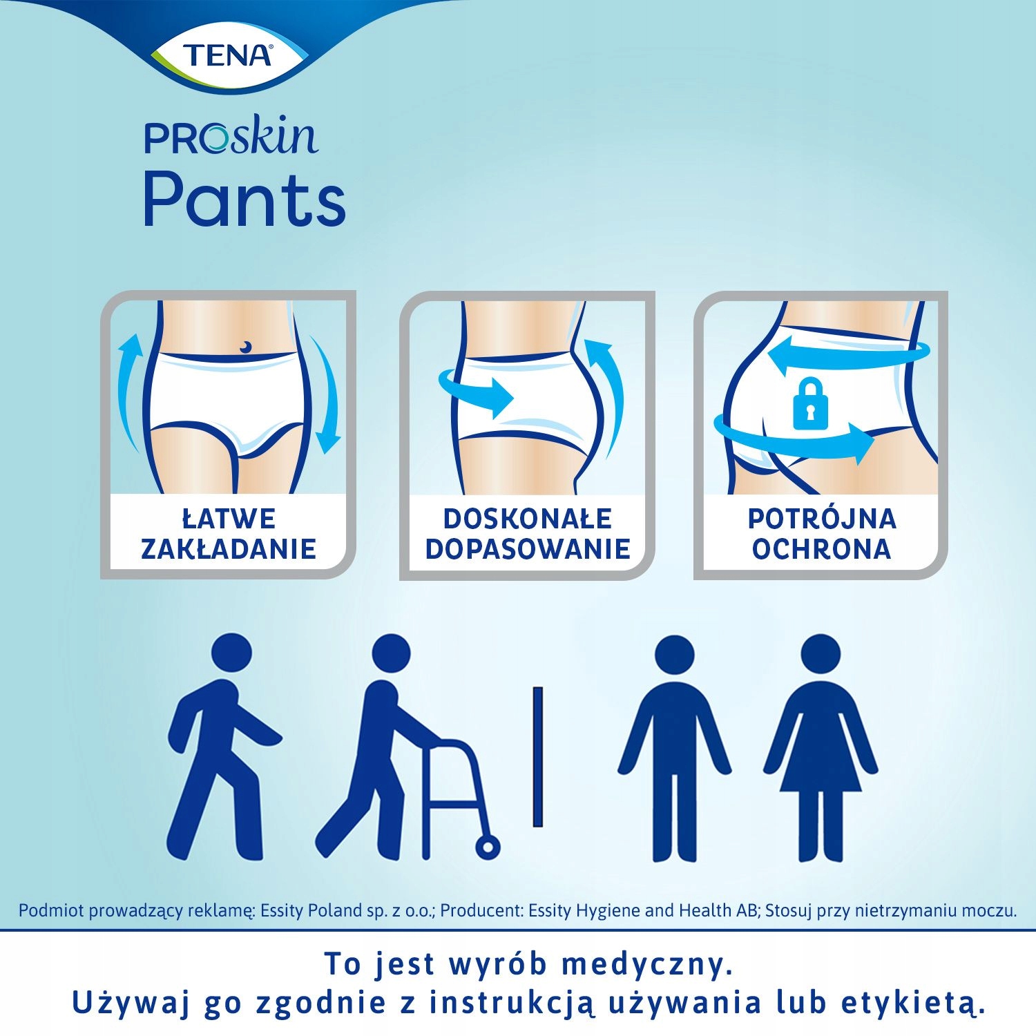 • Продукти Tena Pants Proskin забезпечують потрійний захист від витоку, довгої сухості та м'якості, підтримуючи здоров'я шкіри.• Технологія AdvancedTM FeelDry, що використовується у виробництві, забезпечує швидке поглинання сечі та закриває її від шкіри.