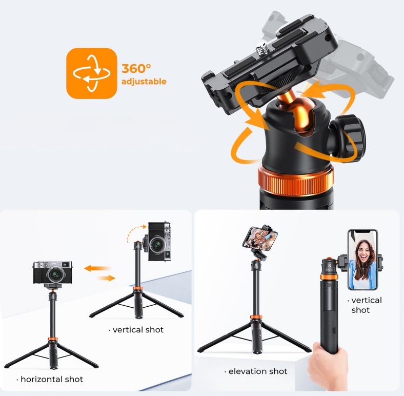Кульова головка фотоштатива K&F Concept Selfie оснащена популярною різьбою 1/4 дюйма. Завдяки цьому вона повністю сумісний із сотнями бездзеркальних камер, компактних і відеокамер.