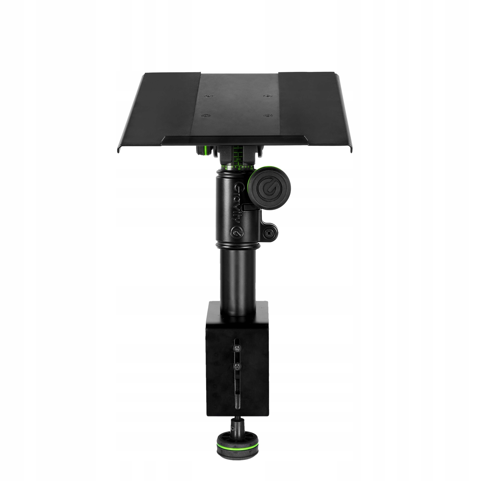 Gravity® вирішує всі ці проблеми за допомогою штатива SP 3102 TM. Підставка для студійного монітора оснащена настільним затискачем, що забезпечує надійне кріплення конструкції до столів із товщиною стільниці не більше 100 мм. Як і інші продукти Gravity, його можна затягнути за допомогою міцної та зручної ручки. На відміну від звичайних настільних підставок, які потребують великої базової пластини для стабільності, SP 3102 TM Clamp Base має розміри лише 10 x 7 см і займає не більше місця, ніж стандартне кріплення для екрана. Розумна конструкція студійної підставки для моніторів зводиться до того, що вона повинна гарантувати, що монітори не виступатимуть надто надто над столом. Це призводить до більшої відстані між слухачем і моніторами, навіть якщо столи не такі широкі, а також забезпечує ідеальне розташування колонок, щоб знайти найкраще місце в кімнаті.