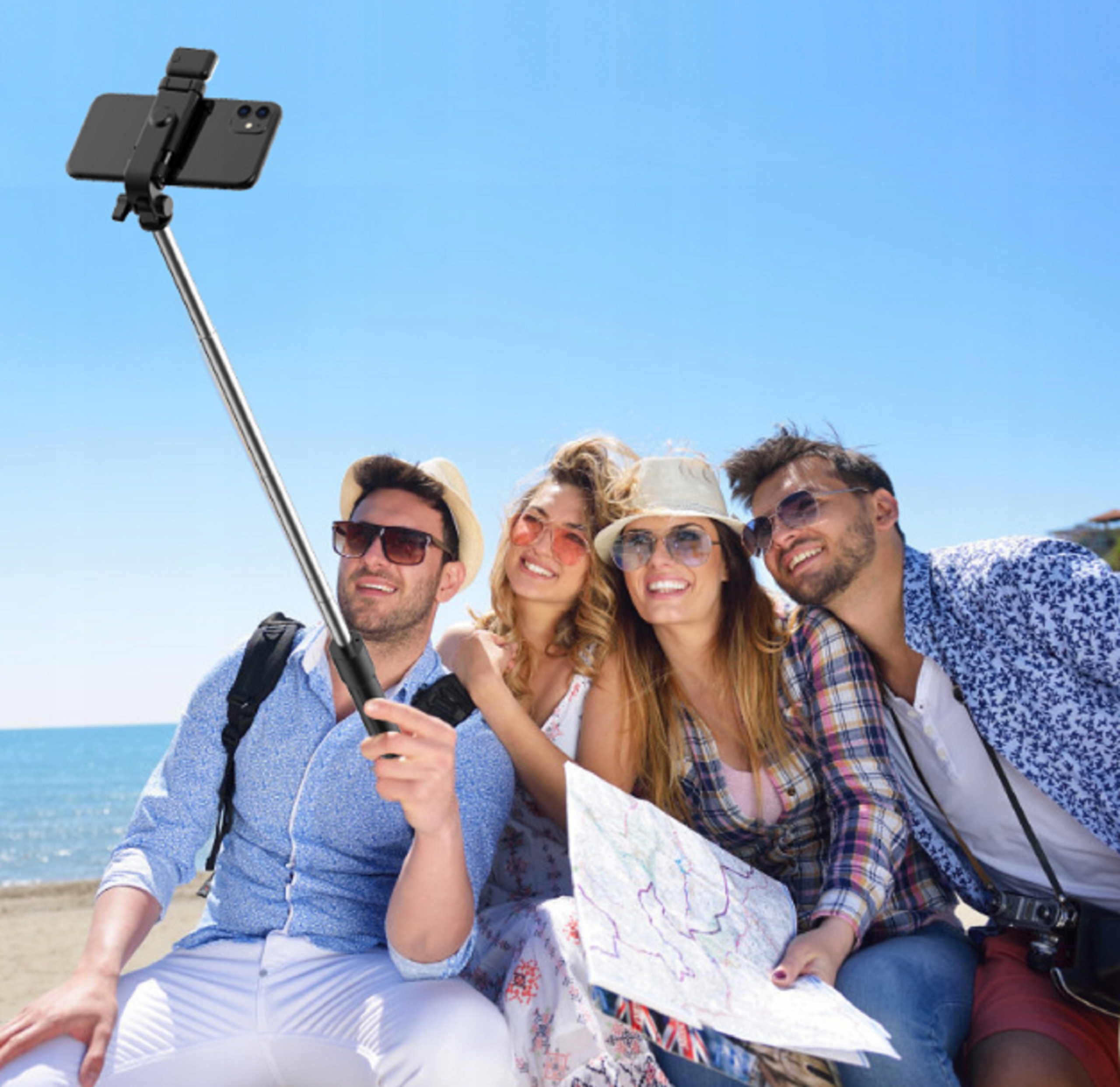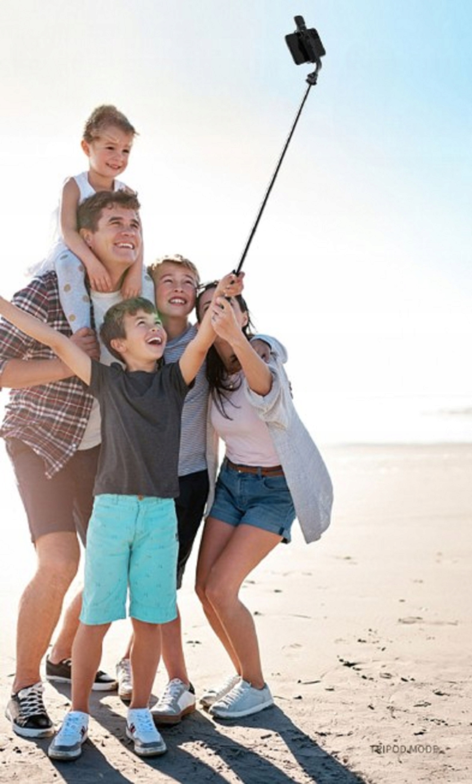 Селфі-палиця оснащена обертовим тримачем телефону, завдяки якому ви можете рухатися на 360°. Телефон можна розташувати у вертикальному або горизонтальному положенні, що дозволяє робити широкий спектр знімків вас і ваших близьких на тлі пейзажу вашої мрії. Крім того, він має 3 ніжки, які в розкладеному стані створюють стабільний штатив.