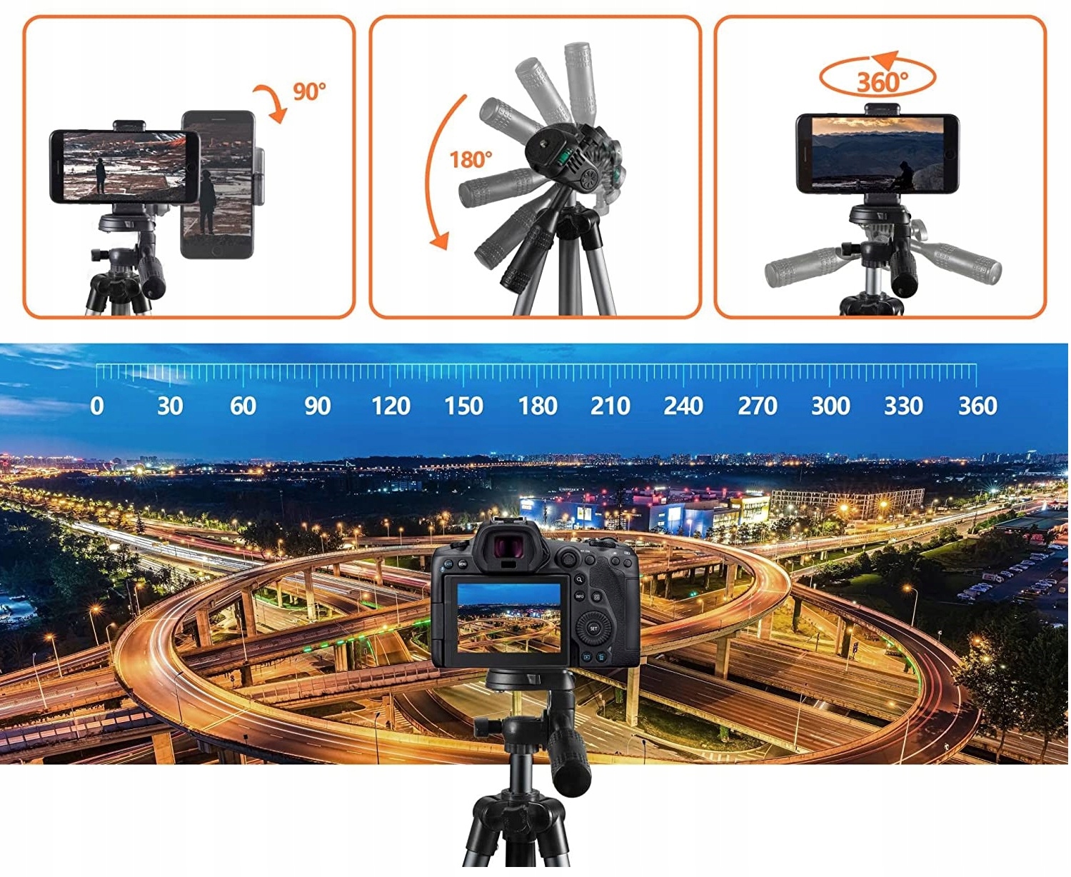 Багатофункціональний комбінезон штатива: Телефонний штатив оснащений стабільною 3-лінійною поворотною головкою, яка може вільно регулювати 360 ° Панорамний кут фотографії, і рівень допомагає вам зберегти його на рівні. Стандартний кріпильний гвинт 1/4 камери "вписується з цифровими дзеркальними дзеркалами, SOLENENS SLR, діяльними камерами, GoPro тощо.