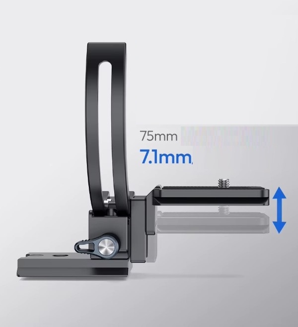 Ручка має можливість плавно регулювати висоту кріплення плитки до камери відносно тримача об'єктива. Налаштування рідка в діапазоні 7,1 мм, тому ми можемо відповідати положенню об'єктива та камери, щоб весь набір був стабільним і, ймовірно, фіксованим.