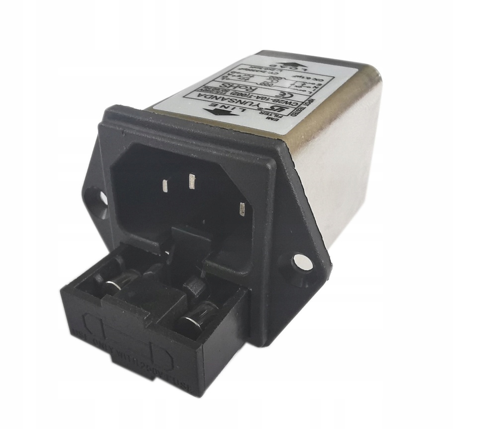 Розетка змінного струму IEC, встановлена на корпусі. Він має вбудований фільтр захисту від перешкод, перемикач і запобіжник.