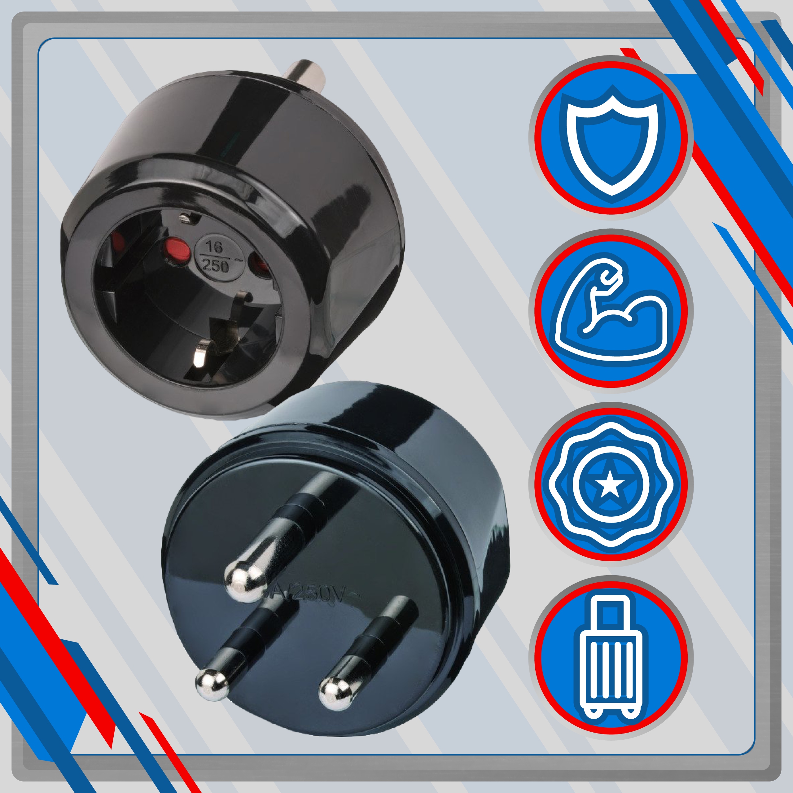 Пропонований дорожній адаптер оснащений підвищеним захистом від випадкового дотику. Використання пластикових пластин для ущільнення контактів розеток.