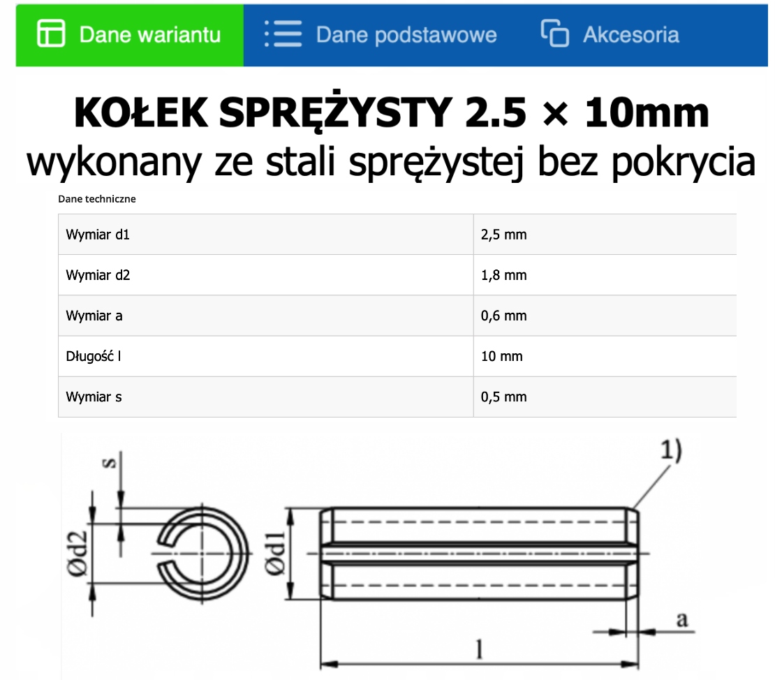 Посилений розрізний пружинний штифт, виготовлений відповідно до DIN 1481 з пружинної сталі без покриття. Для штифтів із зовнішнім діаметром 10 мм або більше однофазна конфігурація є необов’язковою та залежить від постачальника.