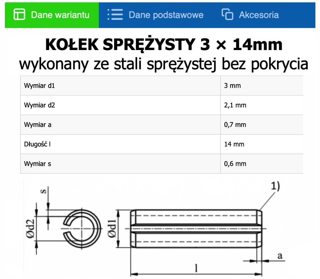 Посилений розрізний пружинний штифт, виготовлений відповідно до DIN 1481 з пружинної сталі без покриття. Для штифтів із зовнішнім діаметром 10 мм або більше однофазна конфігурація є необов’язковою та залежить від постачальника.