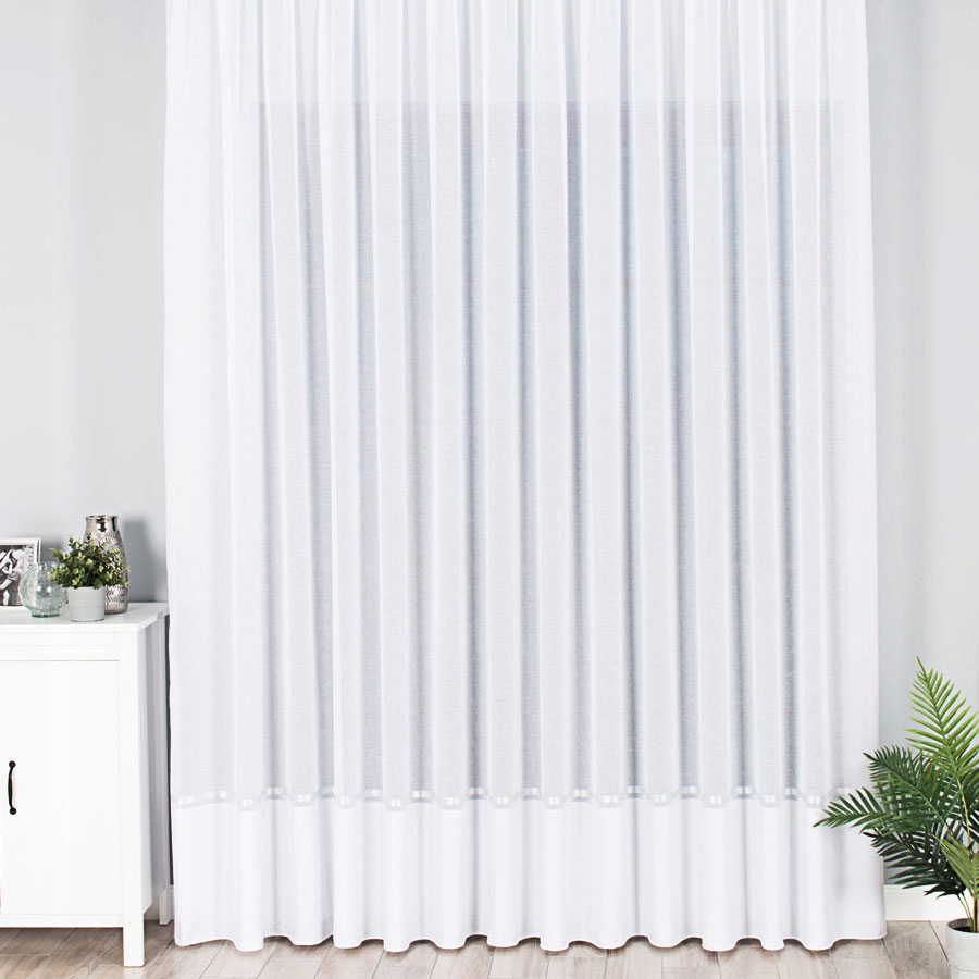 Штора має утяжелення внизу, що робить її ще красивішою. Боковини обрізані, верхня кромка фабрична - потребують підшивання.