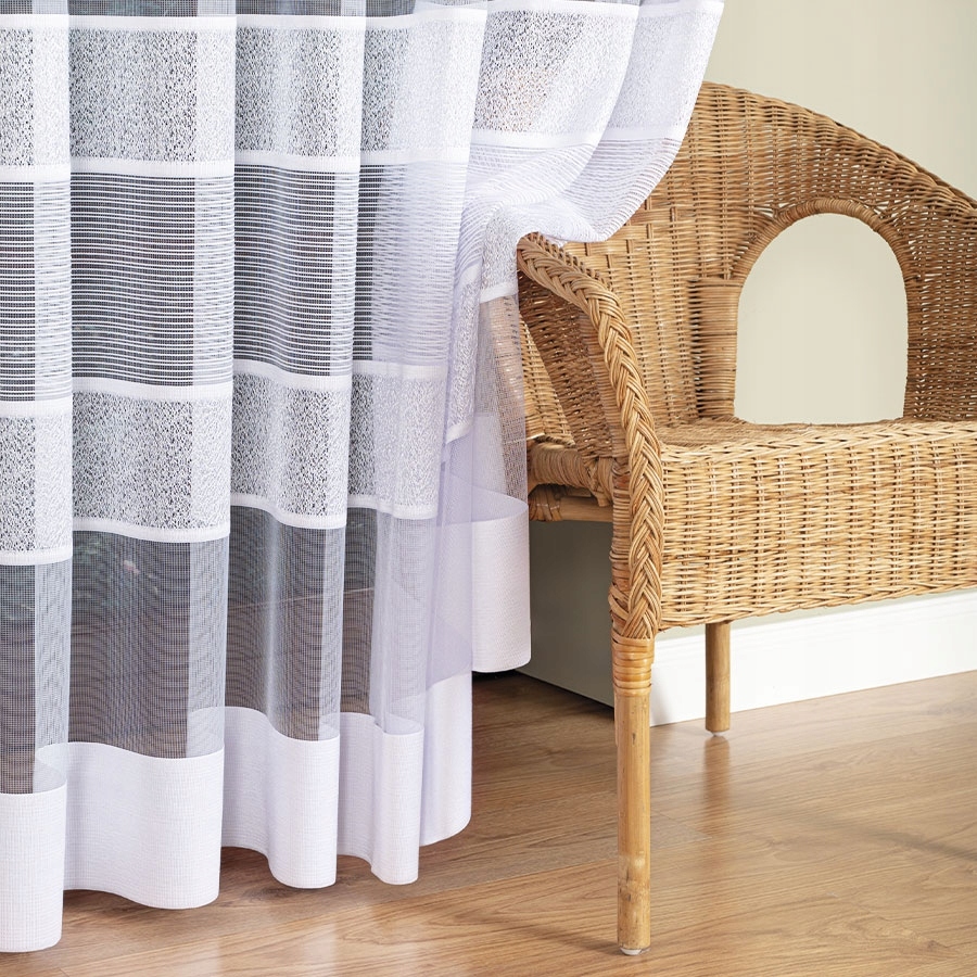 Класична жаккардова штора - це незмінне та стильне доповнення вашого інтер'єру. Білий колір чудово освіжить і скрасить будь-яке приміщення. Товсті смуги з геометричним малюнком надають шторам сучасний характер, ідеально поєднуючись з елегантними та мінімалістичними композиціями. Матеріал м'яко пропускає сонячні промені, забезпечуючи приватність і в той же час не затемнює кімнату. Низ штори оброблений просто, що підкреслює її сучасний та акуратний вигляд. Його універсальна довжина ідеально підходить в якості балконної штори - вона ідеально доповнить обстановку вітальні, вітальні або спальні, в залежності від розташування та вподобань.