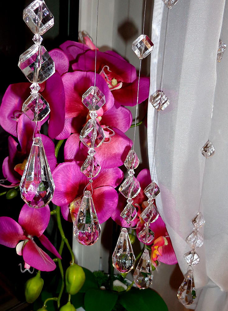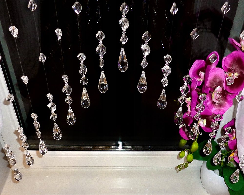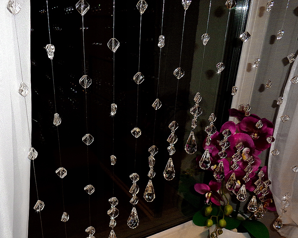 Штора складається з 15 підвісок. Найдовший кулон 160 см, найкоротший 100 см. Намистини нанизані на прозору нитку. На кінці кожного кулона є петелька, яка дозволяє повісити його на карниз, жабо, кільце або шпильку.