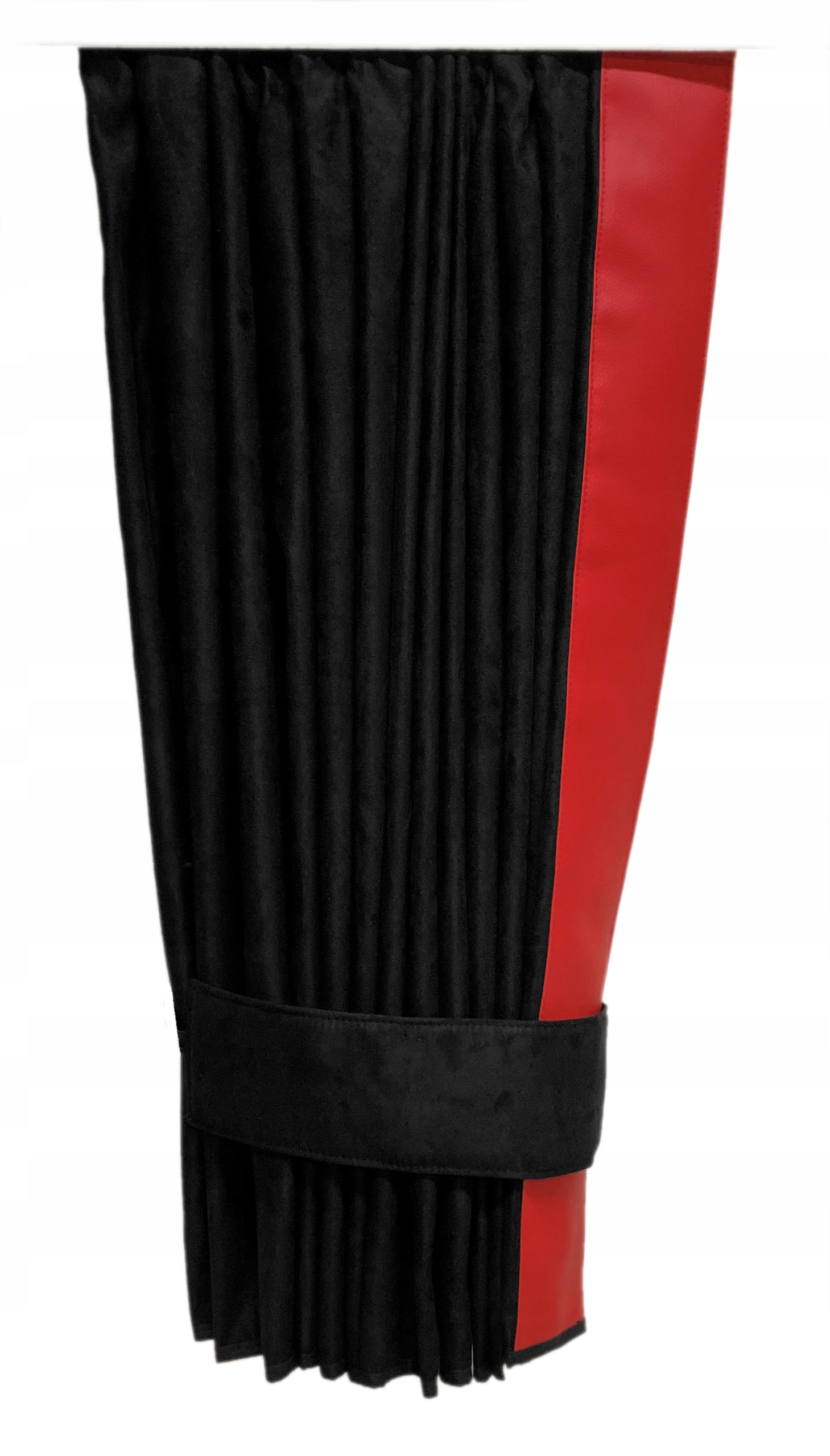 Кожна бічна штора оздоблена кромкою з екошкіри. Ширина краю 9 см. - дивіться фотографії