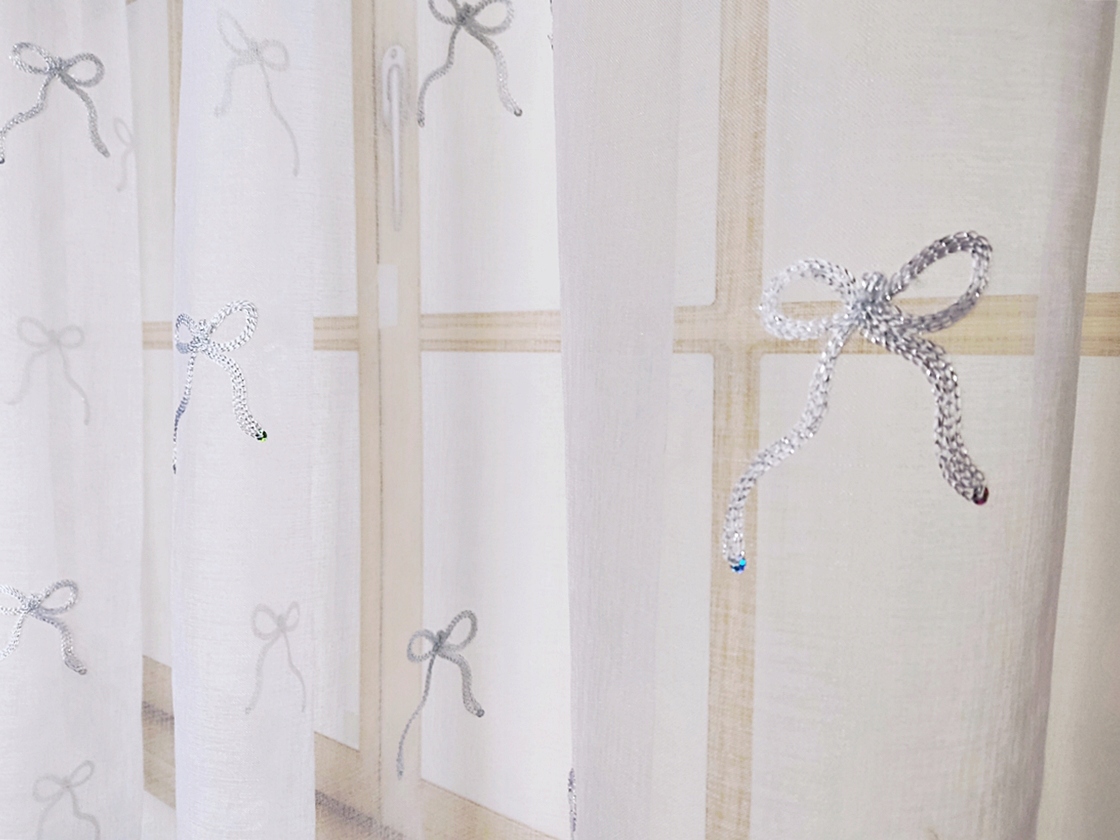 Елегантна біла штора для сучасного інтер'єру з портьєрної тканини етамін. Ніжний білий етамін з вишивкою маленьких бантів, рівномірно розподілених по всій поверхні.Ніжно мерехтливі блискітки внизу кожного бантика.