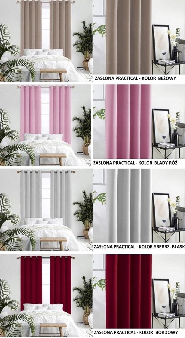 Готова штора з люверсами та колесами. Дуже якісна тканина. Металеві прокладки, внутрішній діаметр приблизно 40 мм і зовнішній діаметр приблизно 70 мм. Дуже гарні, яскраві кольори, які не вимиваються, зберігають колір протягом дуже тривалого періоду використання. Дуже акуратно пошита. Подвійна прошита стрічка жорсткості під люверсами. Штори упаковані в фольговану упаковку. На кожній шторі є етикетка виробника з інструкцією щодо використання та прання. Дуже багата палітра кольорів гарантує, що кожен знайде свій колір.