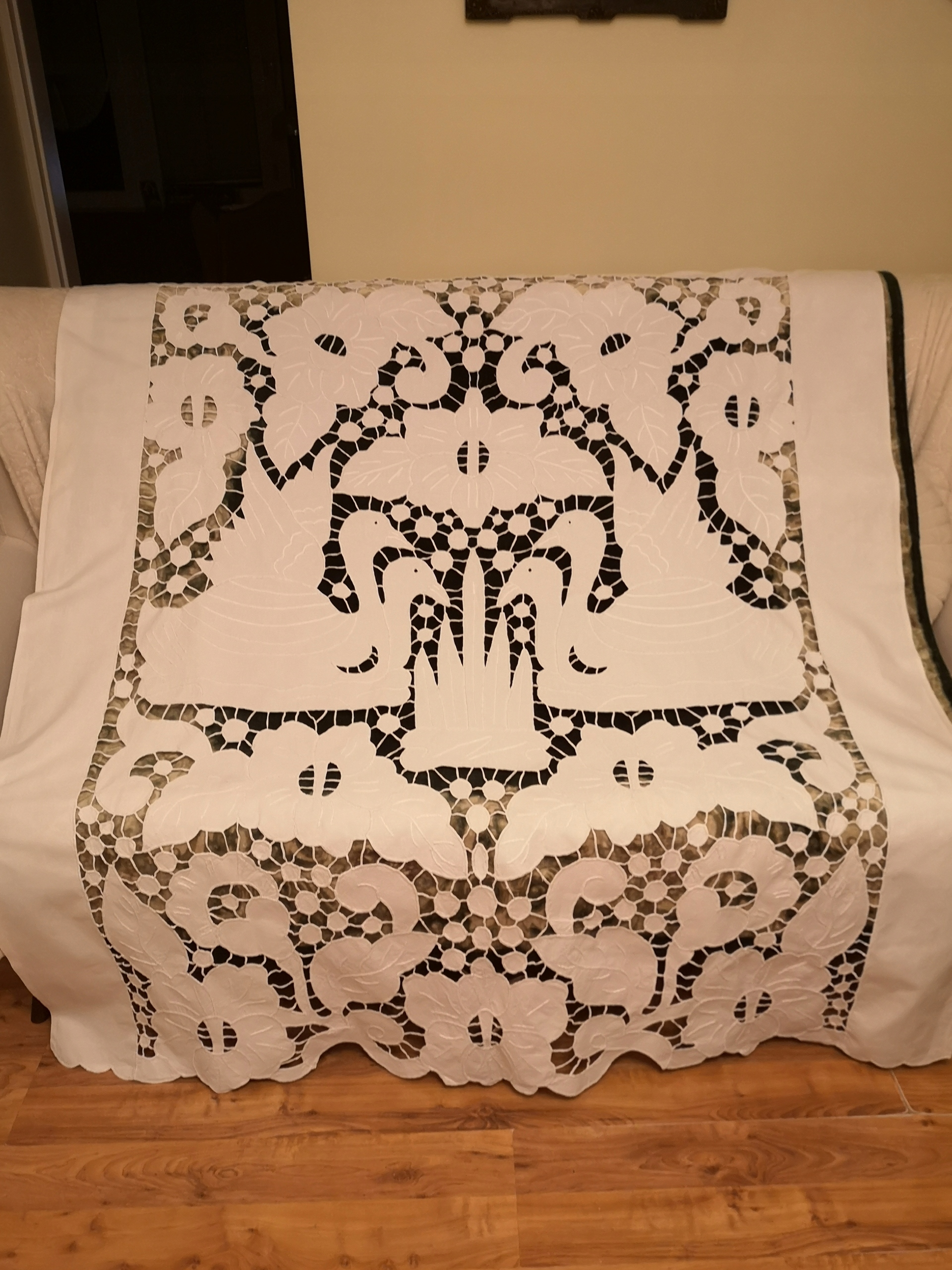 Красива штора злегка сірувато-білого кольору, ручна вишивка Рішельє; післявоєнний продукт (1970-ті?). Тканина була оновлена, все ще міцна та в хорошому стані. Я помітив кілька рожевих крапок (останнє фото) і маленьку кремову смужку біля краю. Розміри: ширина 142 - 145 см, висота до 170 см. Зверху вшитий тунель для карниза. Я запрошую вас робити ставки та на інші мої аукціони.