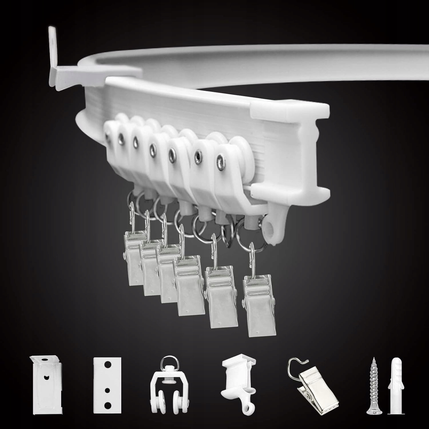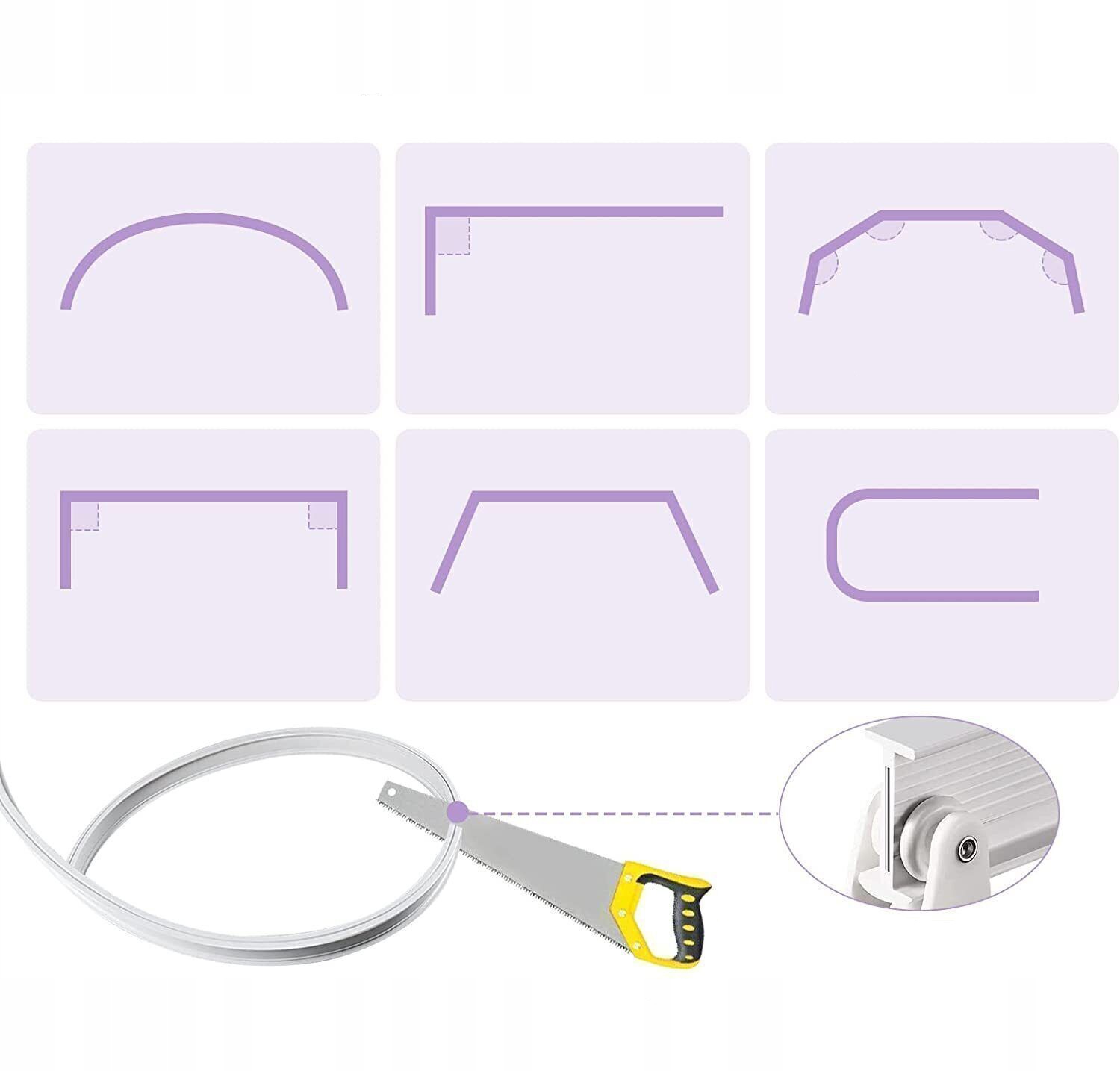 Пластиковий карниз м’який, здатний згинатися та крутитися, щоб підходити до різних розмірів штор, незалежно від того, наскільки гострі чи вузькі кути, але без необхідності використання спеціальних інструментів;