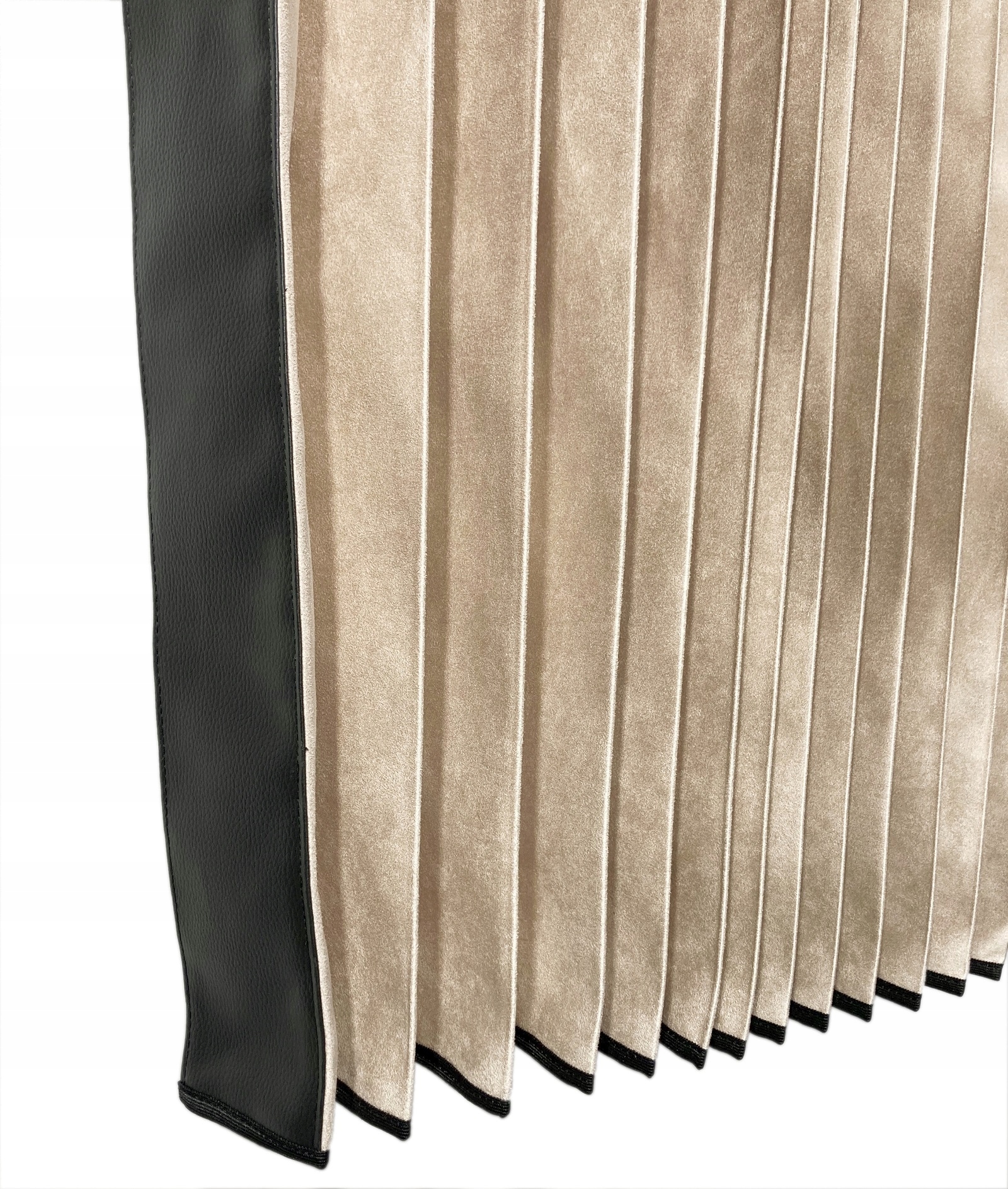 ПЕРЕДНЯ ЧАСТИНА ШТОРИ - КРАЙ ОБРОБЛЕНИЙ ШКІРЯНИМ МАТЕРІАЛОМ, ЩО НАДАЄ ЖОРСТКОСТІ ВСІЙ КОНСТРУКЦІЇ ТА ПОЛЕГШУЄ СКЛАДАННЯ ВНОЧІ