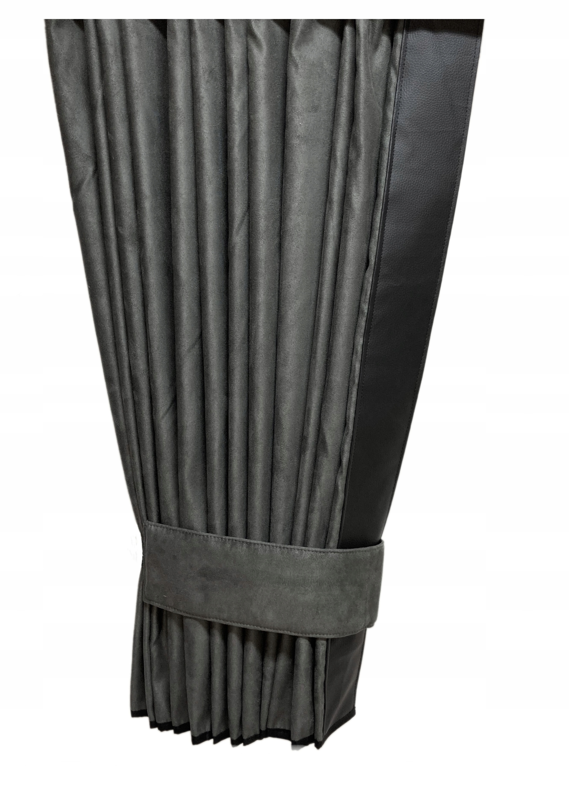 Кожна бічна штора оздоблена кромкою з екошкіри. Ширина краю 9 см. - дивіться фотографії