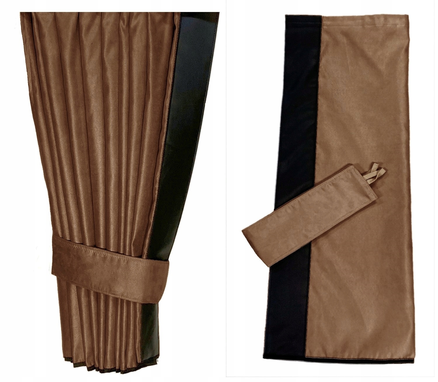 Кожна бічна штора оздоблена кромкою з екошкіри. Ширина краю 9 см. - дивіться фотографії