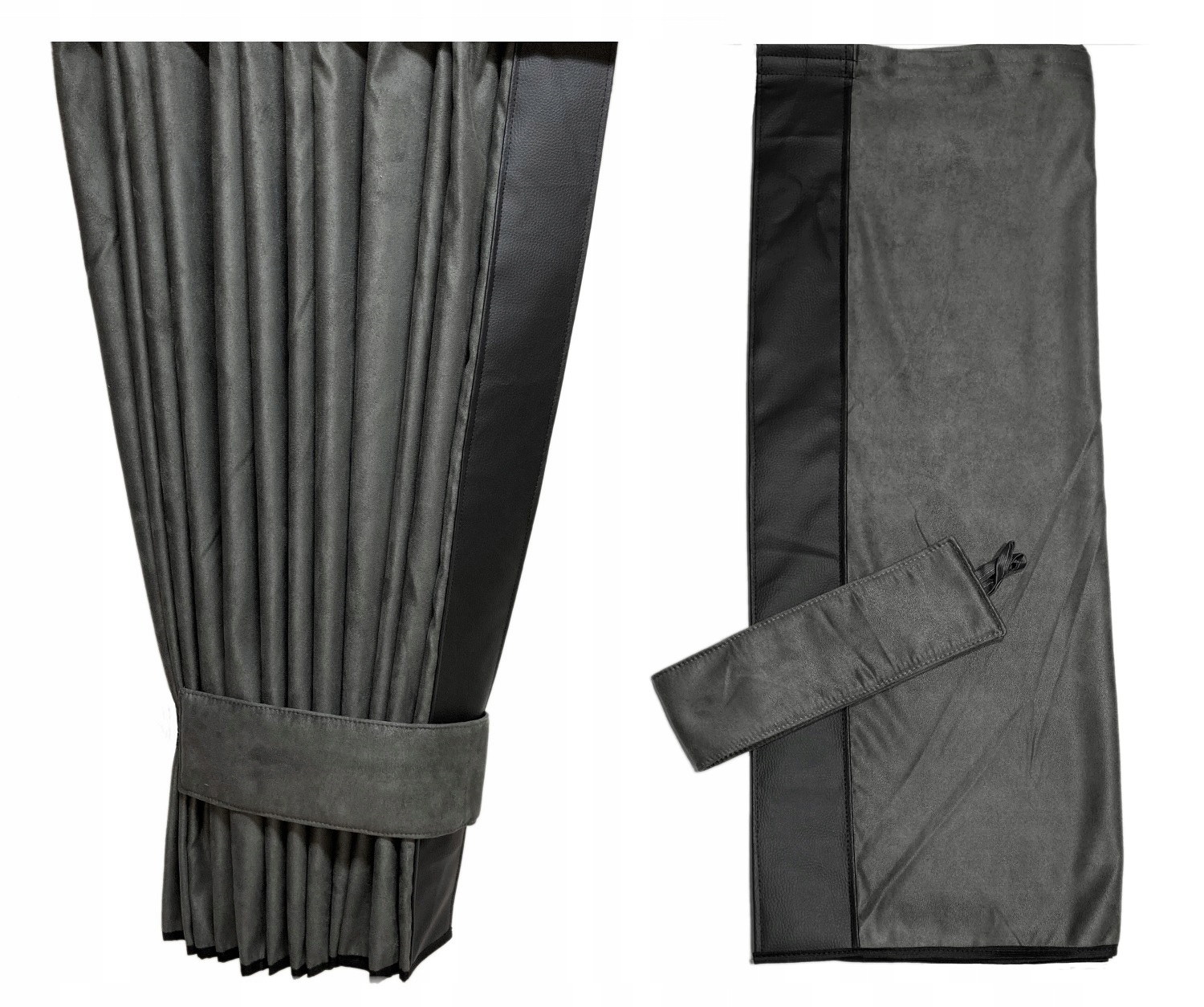 Кожна бічна штора оздоблена кромкою з екошкіри. Ширина краю 9 см. - дивіться фотографії