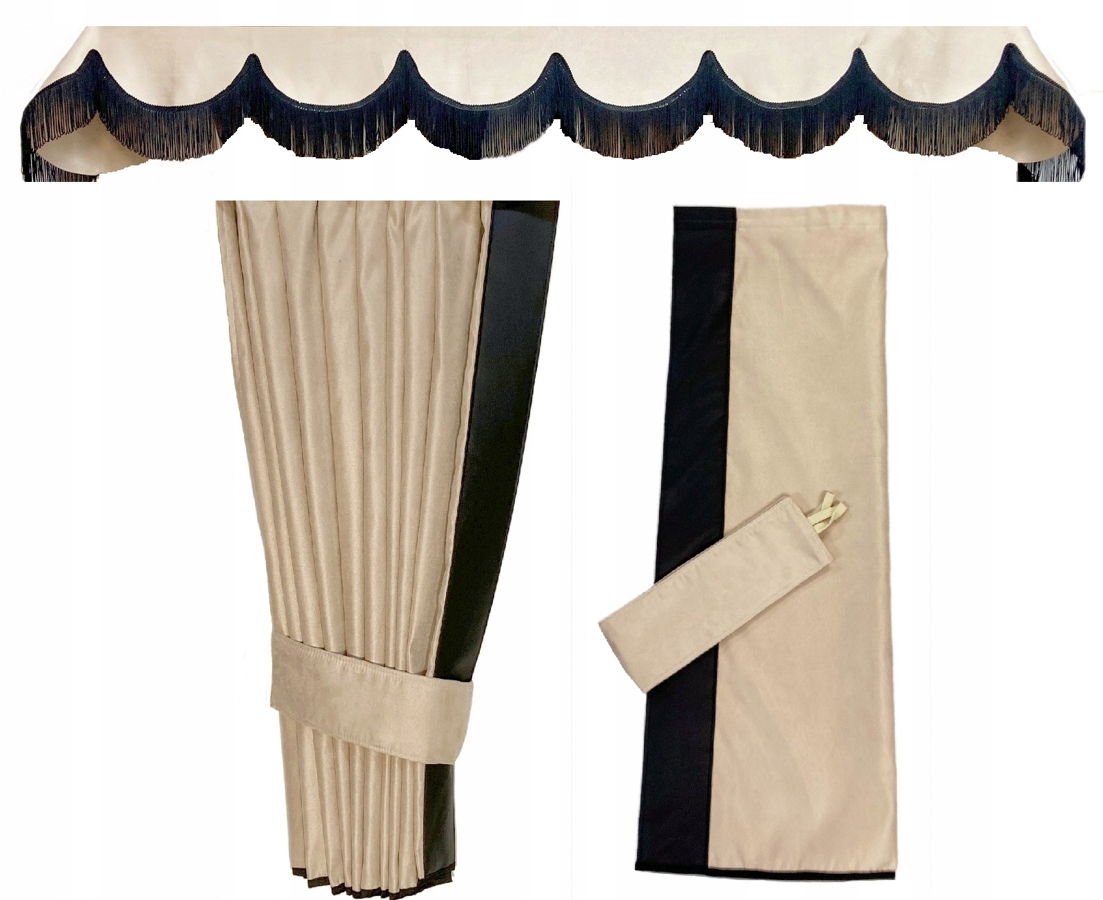 Кожна бічна штора оздоблена кромкою з екошкіри. Ширина краю 9 см. - дивіться фото