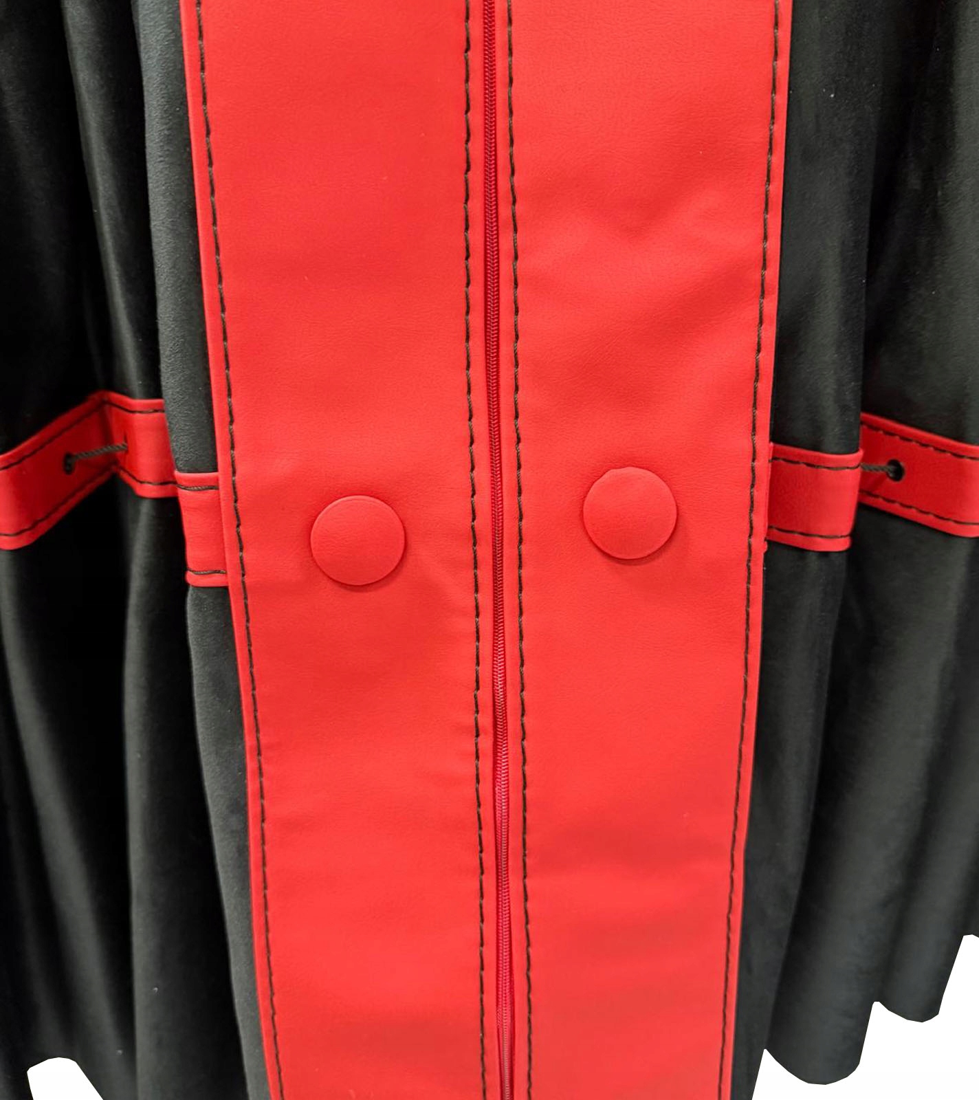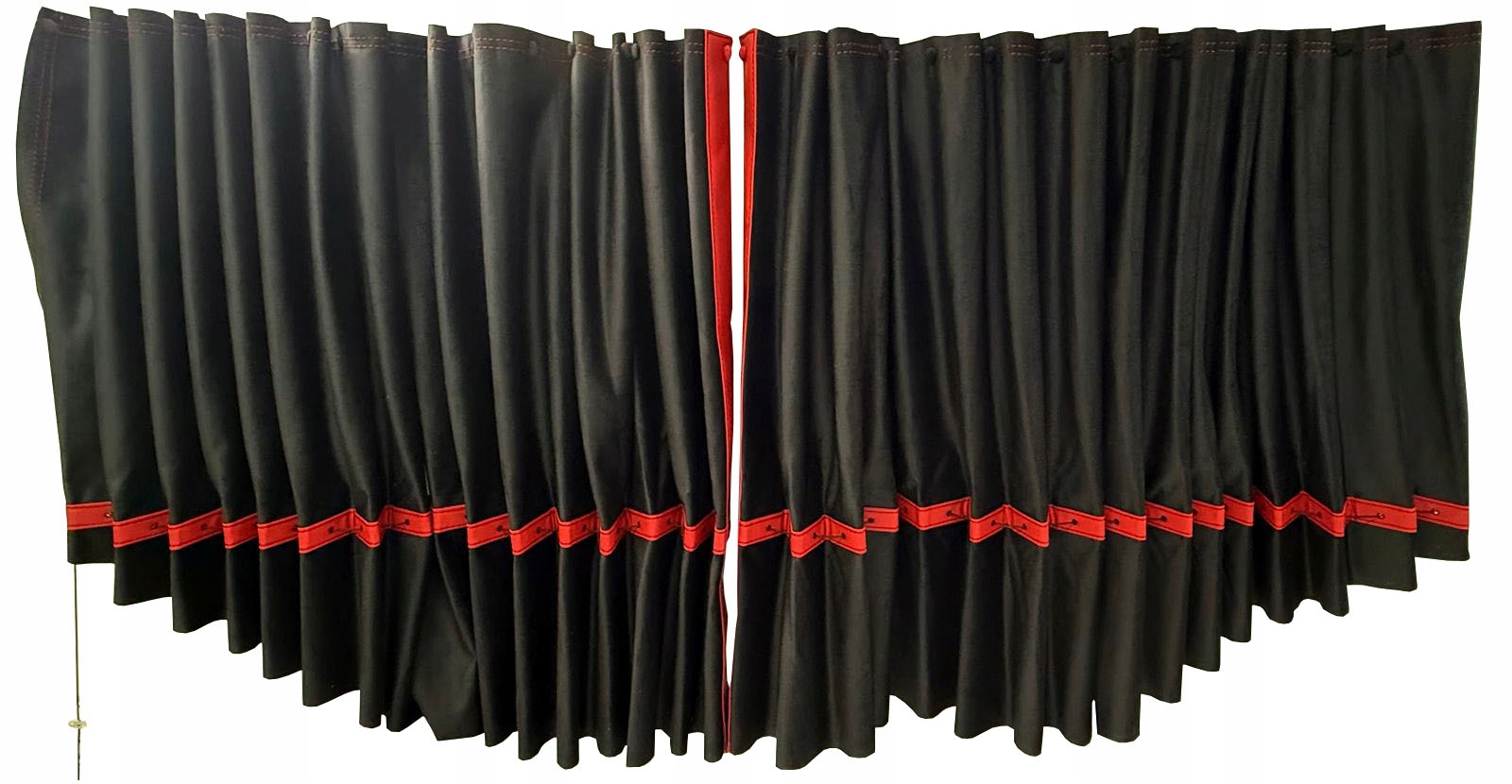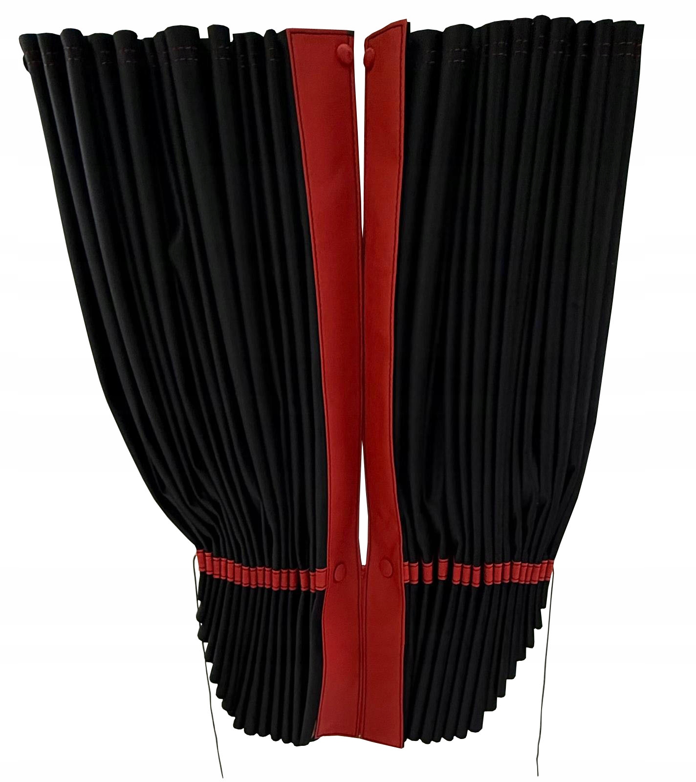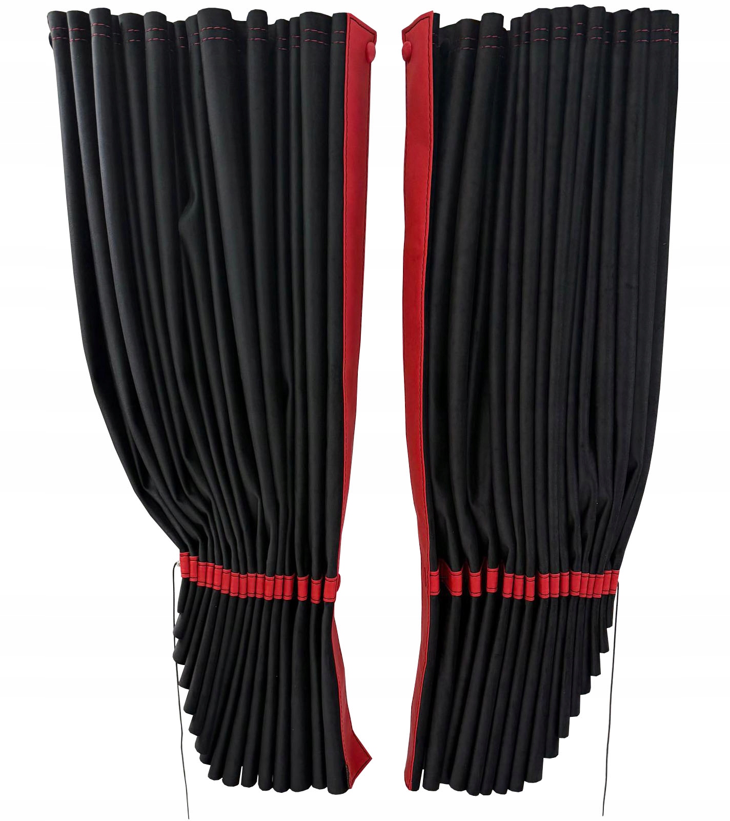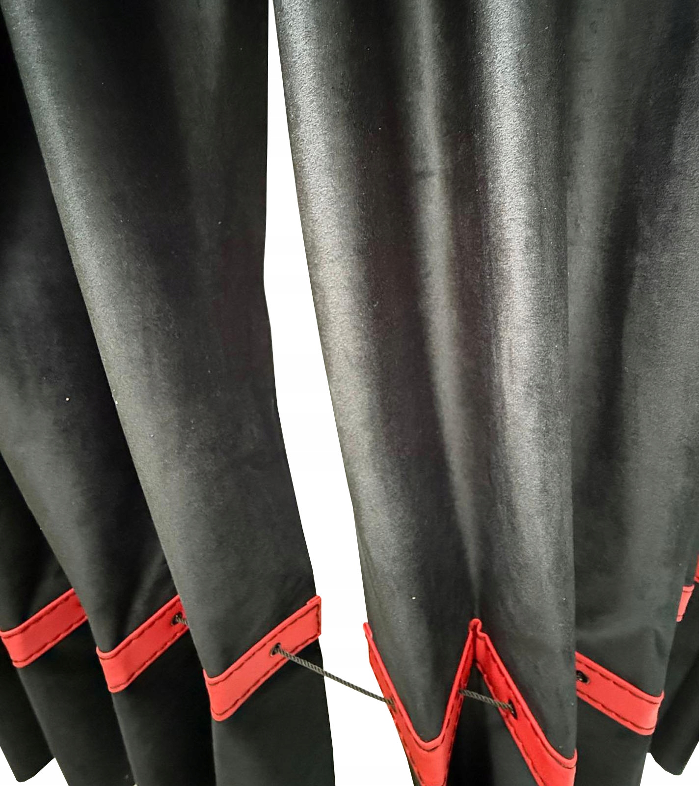 Штори виготовлені з двошаровоїм'якої і міцної тканини Magic Velvet - плюшу, завдяки чому не пропускають світло, а також червоні вставки зі шкірозамінника (екошкіра).