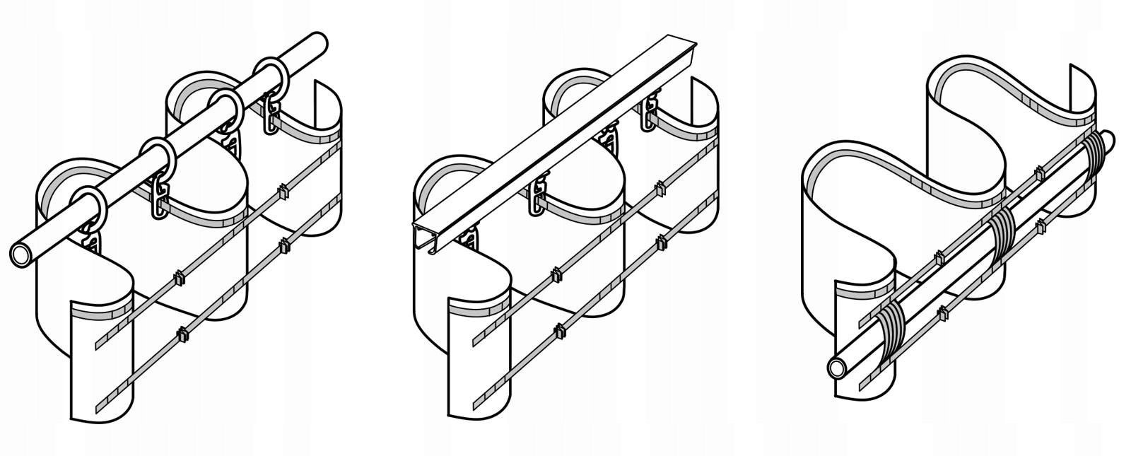 - Штора або портьєра зі збірною стрічкою кріпиться до карниза за допомогою жабо або гачки