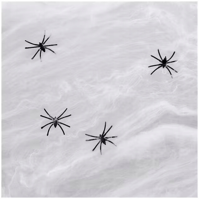 ✅ Біла павутина з чотирма декоративними чорними павуками, які легко кріпляться до матеріалу, посилюючи декоративний ефект,