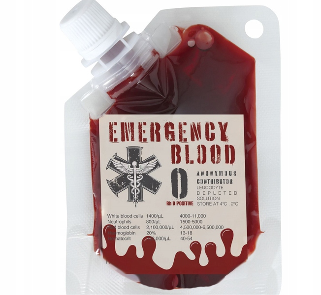 - Форма: рідина в мішку, що імітує справжній мішок крові