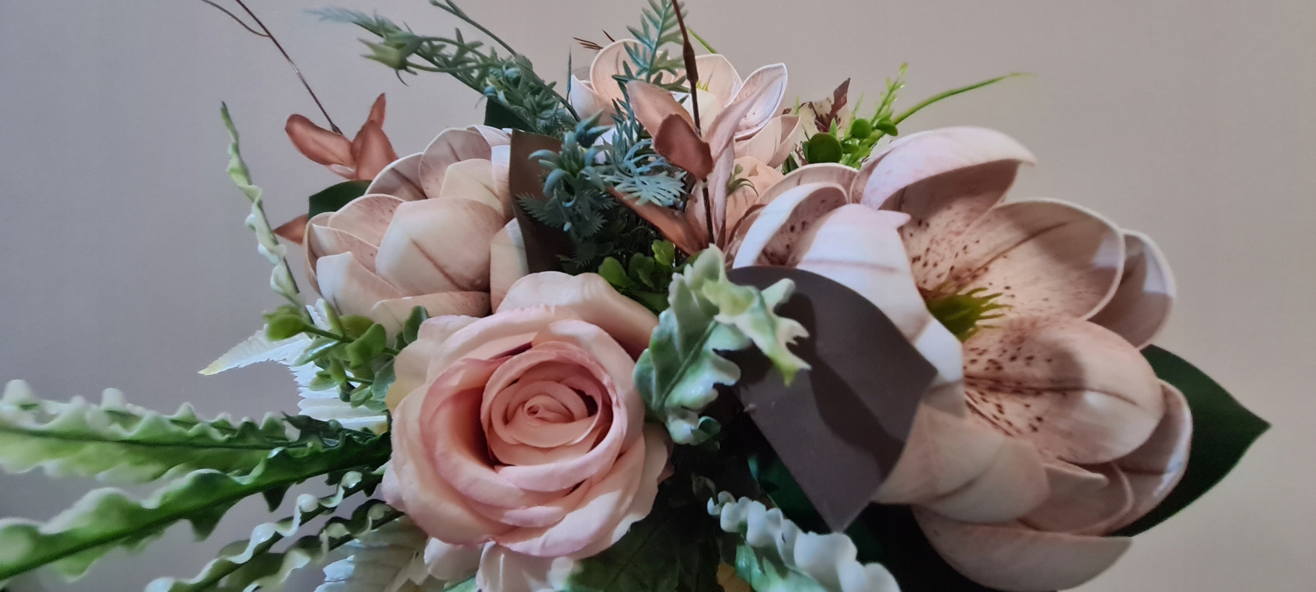 Надгробний камінь, виготовлений на елегантній яскравій пластиковій основі з розмірами 20x20x15 см. Прикраса складається з високоякісних штучних квітів у пастельних відтінках рожевих та аксесуарів (зелених та білих листя, які надають цілому природному, гармонійному та унікальному зовнішньому вигляду, що відповідає поточному сезону.