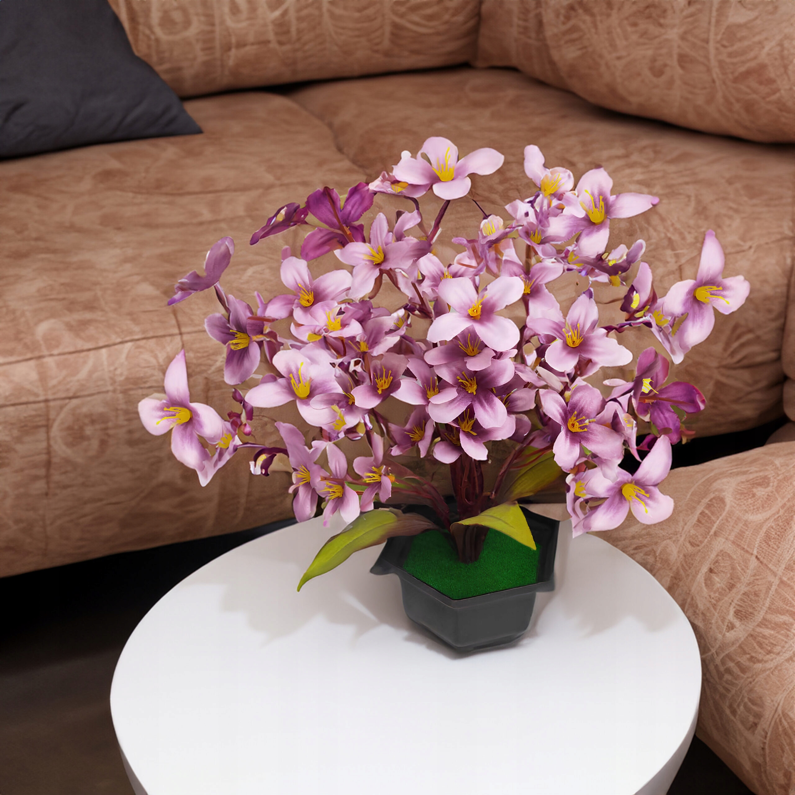 Це ідеальна рослина для декорів, у яких важко зберегти свіжі квіти. Квітка розміщена в білий пластиковий горщик, наповнений штучною травою. p>