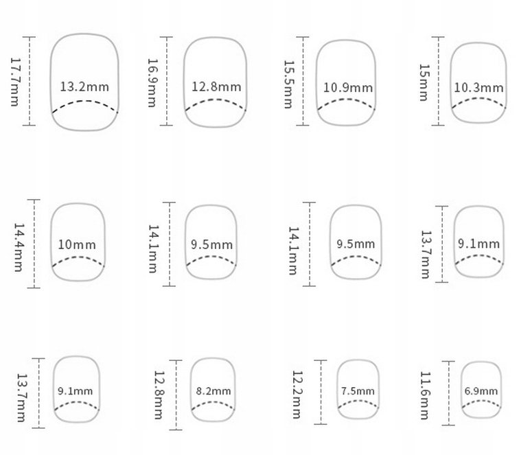 Набір має різні розміри, щоб ви могли ідеально підібрати штучний ніготь до натуральної нігтьової пластини.