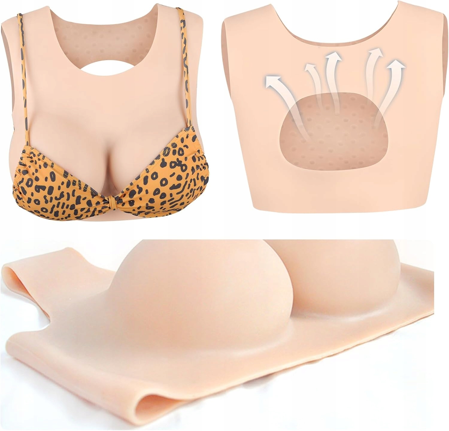 Нагрудник із силікону має круглий низький комір ергономічної форми та вентильовану порожнисту спинку, яка точно відтворює природні пропорції від ключиці до грудини. Це забезпечує реалістичний вигляд фігури та високий комфорт при носінні.