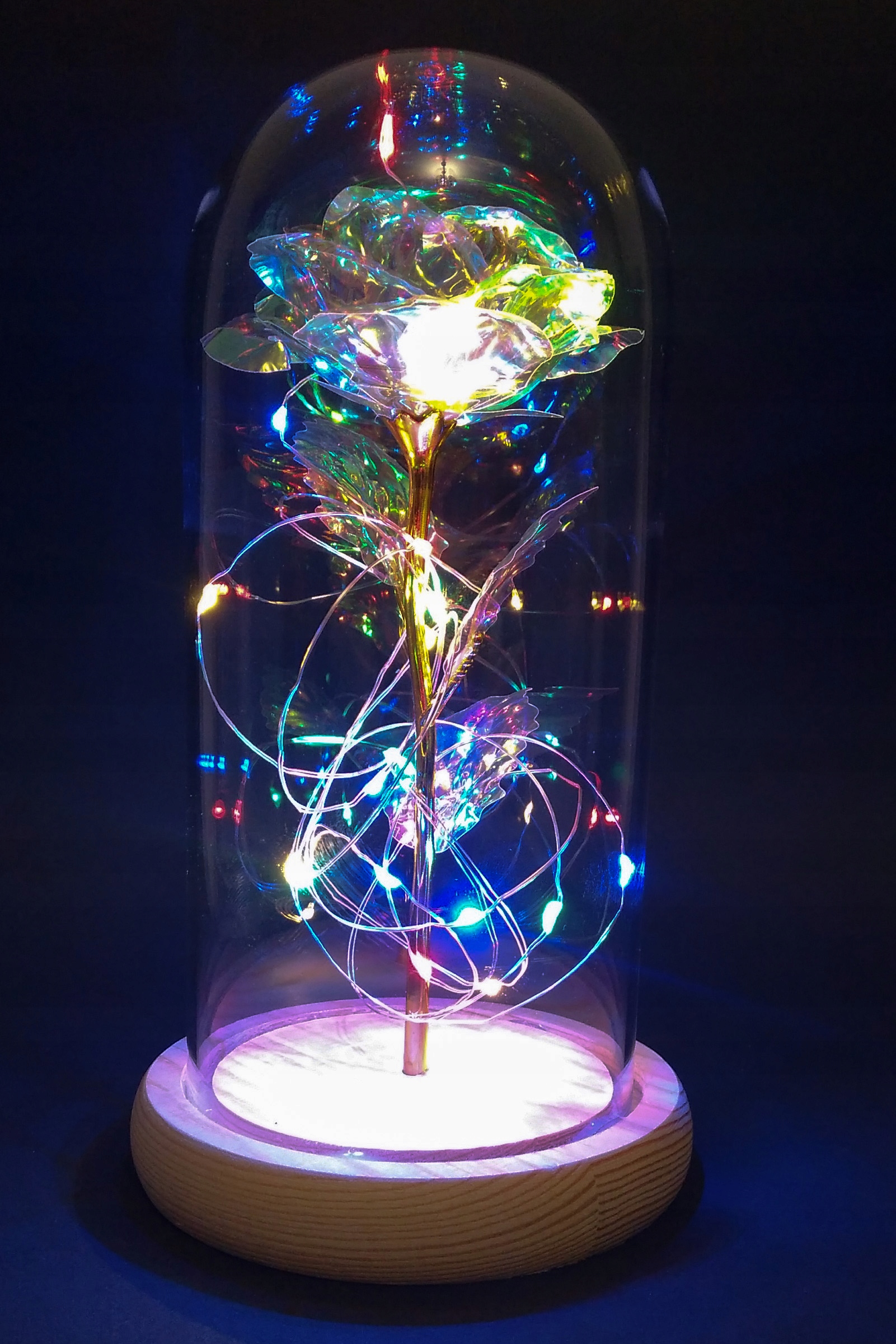 Барвиста, прозора, райдужна штучна троянда із золотою ніжкою в скляному куполі, з постійним кольоровим світлодіодним освітленням, на легкій дерев’яній підставці з подарунковою коробкою з вікно. h2>