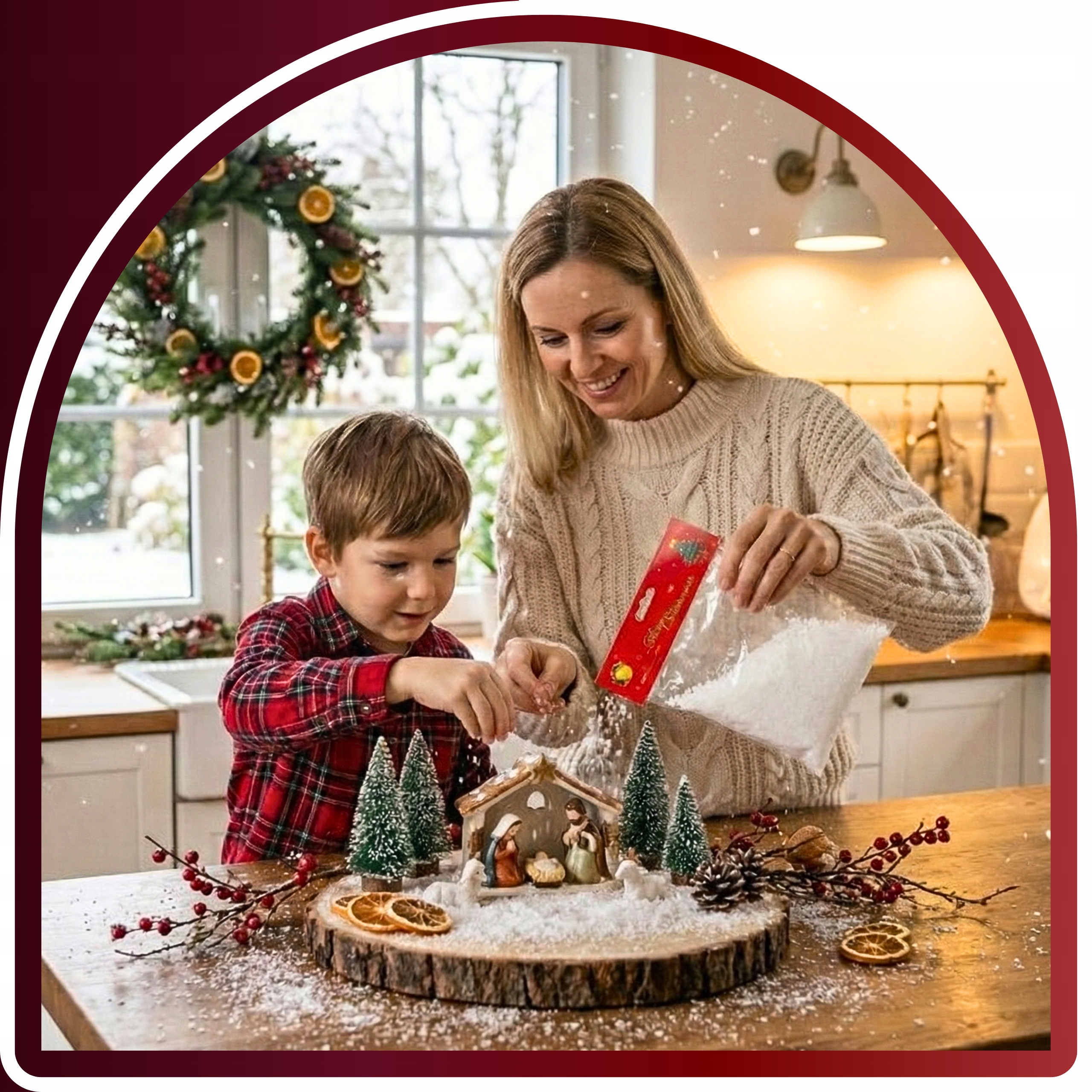 Ви та ваша дитина створюєте різдвяну сцену, сповнену радості - штучний сніг створює миттєвий чарівний ефект, завдяки якому спільна гра виглядає як справжня зимова казка.