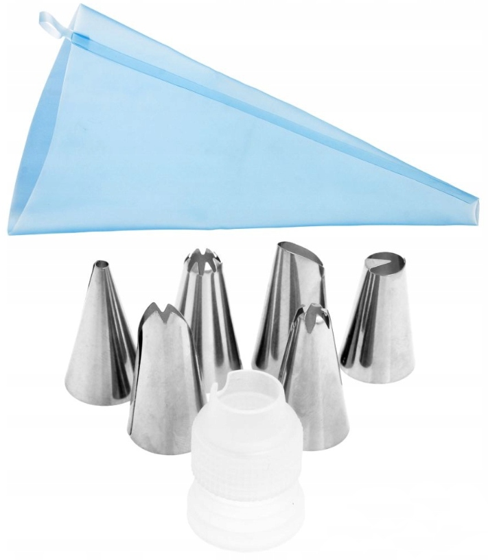 Набір аксесуарів для декорування десертів - тортів, тортів, капкейків. У набір входять 6 наконечників з нержавіючої сталі, кондитерський мішок і адаптер.