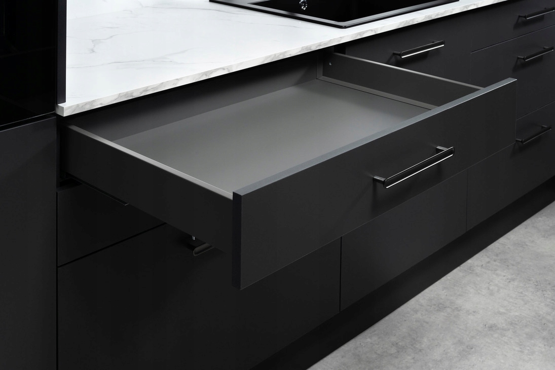 Тонкий стрункий ящик з тонкою матрицею оснащений тихим закриттям і повним розширенням. Завдяки функції тихого закриття, ящик не клацає, а продукти всередині нього не рухаються. Повний слайд полегшує використання всієї глибини ящика. Ящик забезпечує неприємності -безперебійне використання протягом багатьох років.