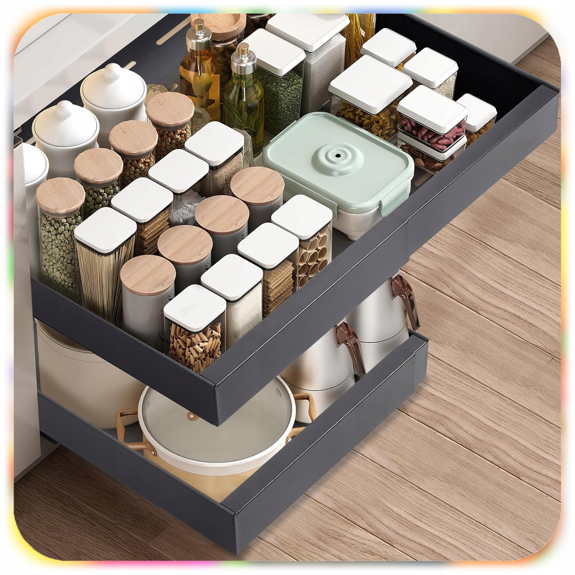 Перетворіть неприбраний простір на ідеально організовану зону зберігання завдяки універсальній висувній полиці з регульованою шириною. Це функціональне рішення добре підійде на кухні, у ванній чи коморі. – там, де вам потрібно більше місця без свердління та складання.