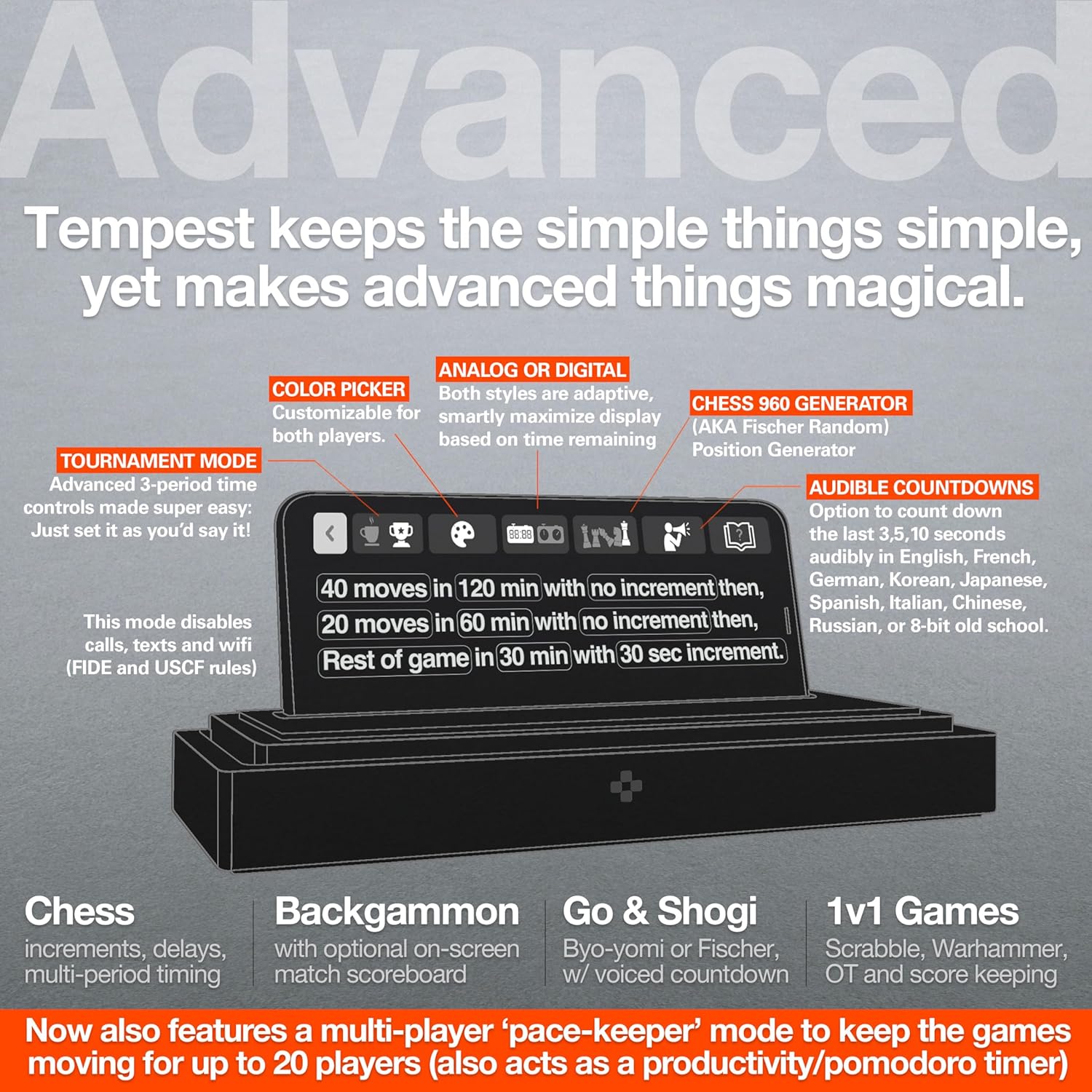 - Невидима технологічна інноваційна ідея полягає в тому, що у вас вже найкращий екран у кишеньковому сміття?). Давайте перетворимо його на найкращий шаховий годинник в історії! Як? База Tempest надає кожен телефон безпечно (навіть догори дном!) Завдяки цьому наше програмне забезпечення використовує виявлення нахилу, розроблене в основі, є суто механічним і, як результат, не потребує акумулятора. Технологія невидима, тому ви можете зосередитись на грі. Розумний, правда?
