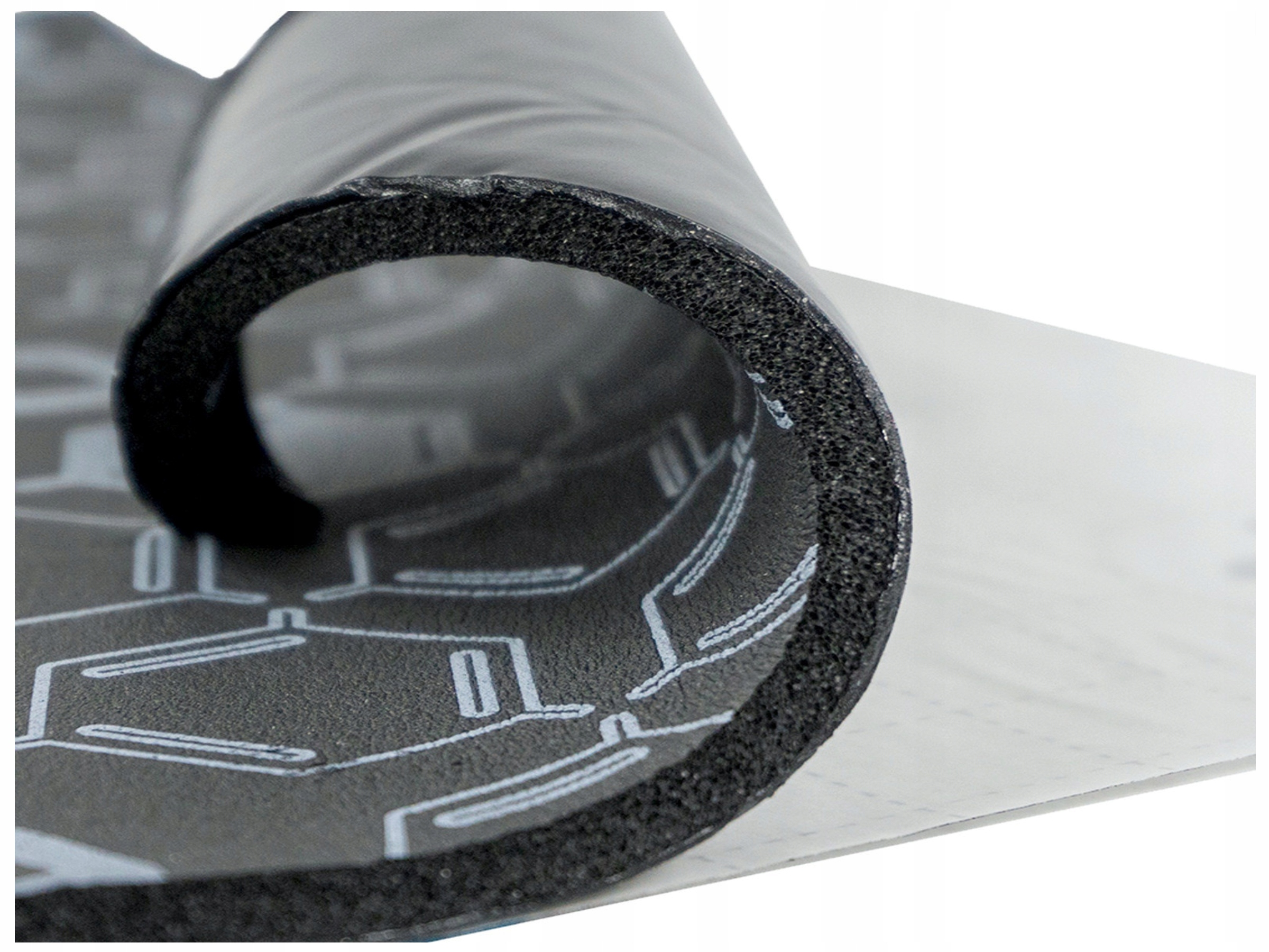 - Visual features: multilayer material, outer layer of foamed black rubber with printed white graphics