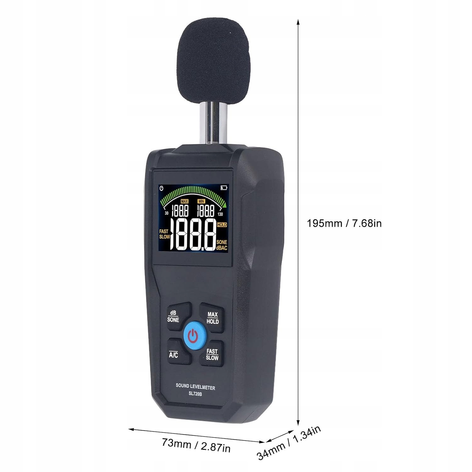 Широкі сфери застосування. Цей вимірювач децибелів має широкий спектр застосувань і може використовуватися в шумотехніці, контролі якості, кіномайданчиках, будівельному шумі, автомобільному шумі, охороні здоров’я, домашніх школах та інших галузях. Швидка реакція Якщо ви відстежуєте раптові чи поступові зміни шуму, пристрій для вимірювання шуму може вимірювати високу частоту дискретизації 125 мс і низьку частоту дискретизації 1000 мс. 12-дюймовий конденсаторний мікрофон У цьому шумомірі використовується 12-дюймовий конденсаторний мікрофон, який гарантує незмінно надійне й точне виявлення навіть найменших децибел шуму, тому вони не залишаться непоміченими. Кольоровий дисплей із підсвічуванням Цей шумомір оснащений кольоровим дисплеєм із підсвічуванням, який не тільки забезпечує чіткі показання, але й надає користувачеві можливість працювати з пристроєм у різних умовах освітлення. Висока точність. Цей цифровий шумомір забезпечує високий рівень точності при рівнях шуму в діапазоні від 30 до 130 дБ, забезпечуючи щоразу точні показання.