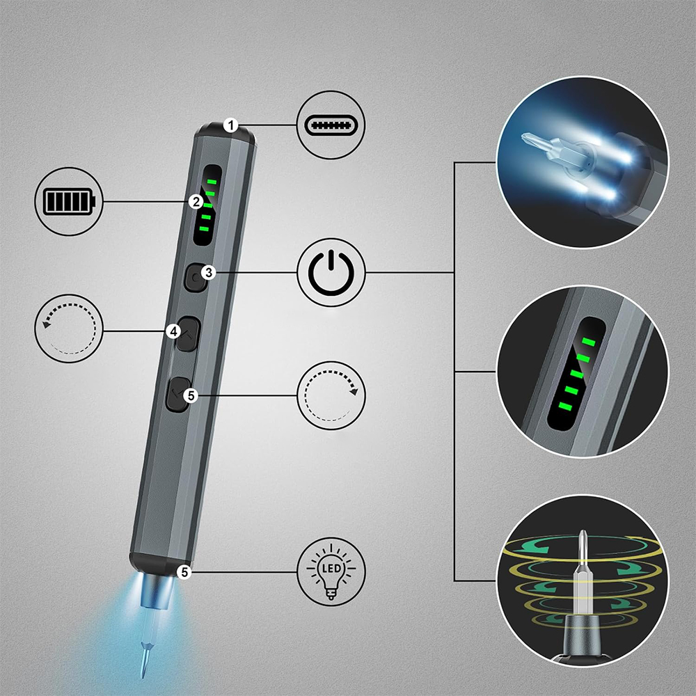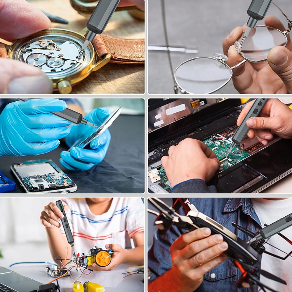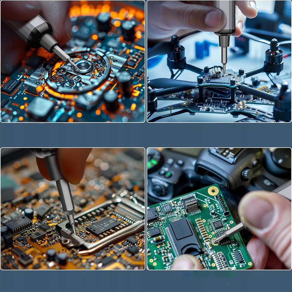 - Набір включає: 1 потужну електричну викрутку, 64 прецизійних біта для викрутки, 1 зарядний кабель USB Type-C, 1 присоску, 1 інструкцію (англомовна версія не гарантується), 1 пару гострих пінцетів, 1 стилус для скидання, 1 магнітний килимок із лінійкою та 2 регулятори ширини. Ця електрична викрутка підходить для всіх поширених типів гвинтів, у тому числі хрестоподібних, зіркоподібних, трикутних, шестигранних, п’ятикутних і трикутних, що робить її обов’язковим пристроєм для ентузіастів техніки та любителів DIY.