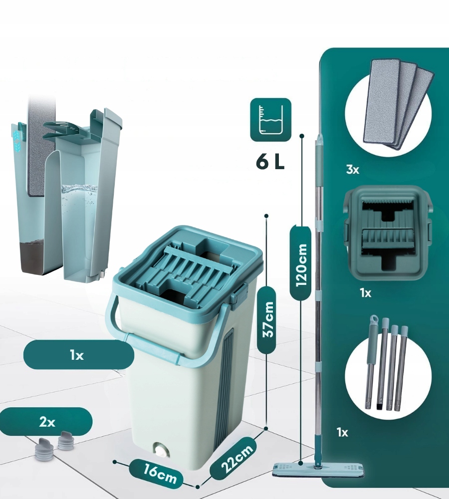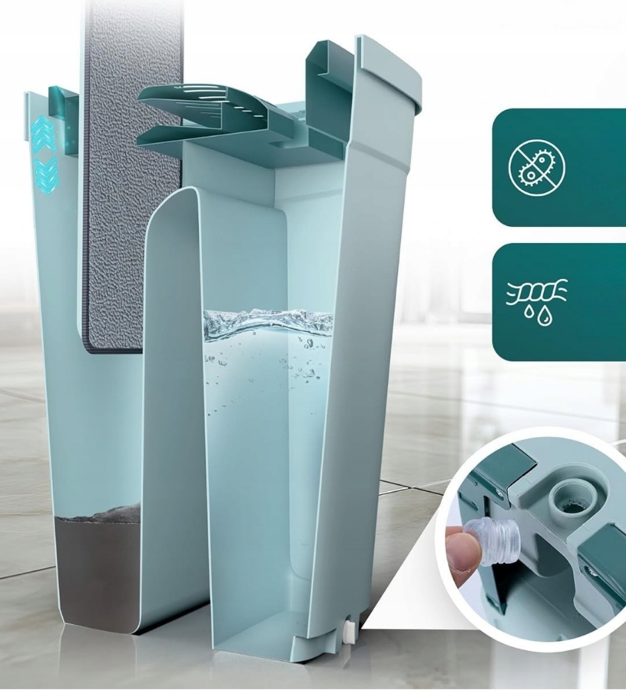 Завдяки двокамерному відру мити підлогу стає простіше - одна камера призначена для чистої води з миючим засобом, а інша - для віджимання брудної води. Серветки з мікрофібри добре поглинають і щадять поверхні – ідеально підходять для деревини, плитки, ламінату чи мармуру, не залишаючи смуг і подряпин.