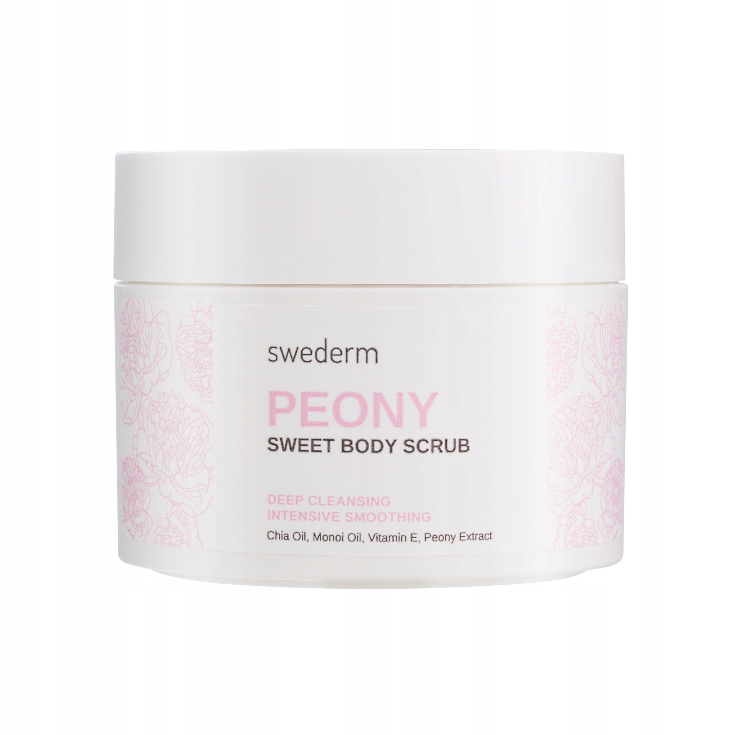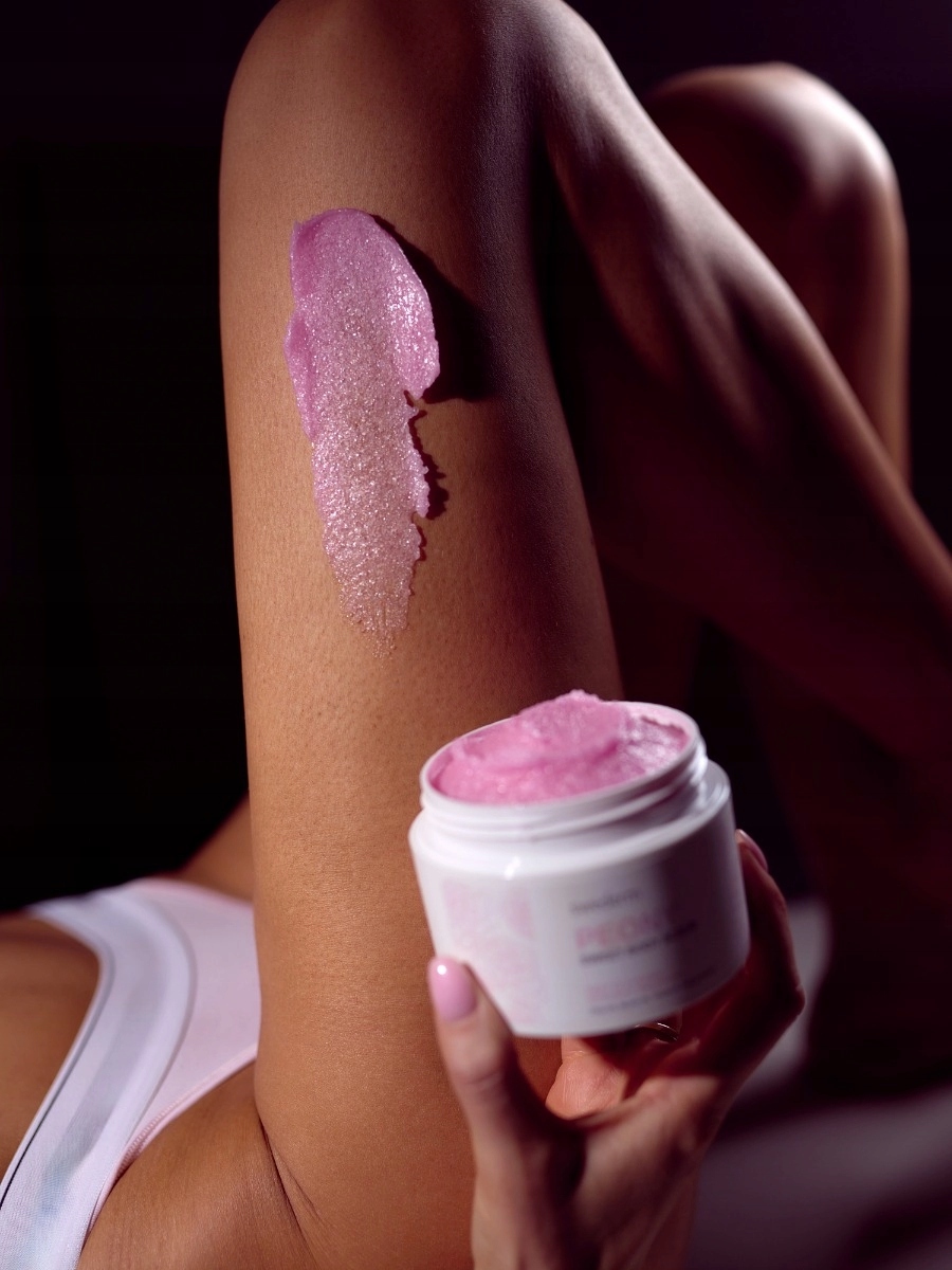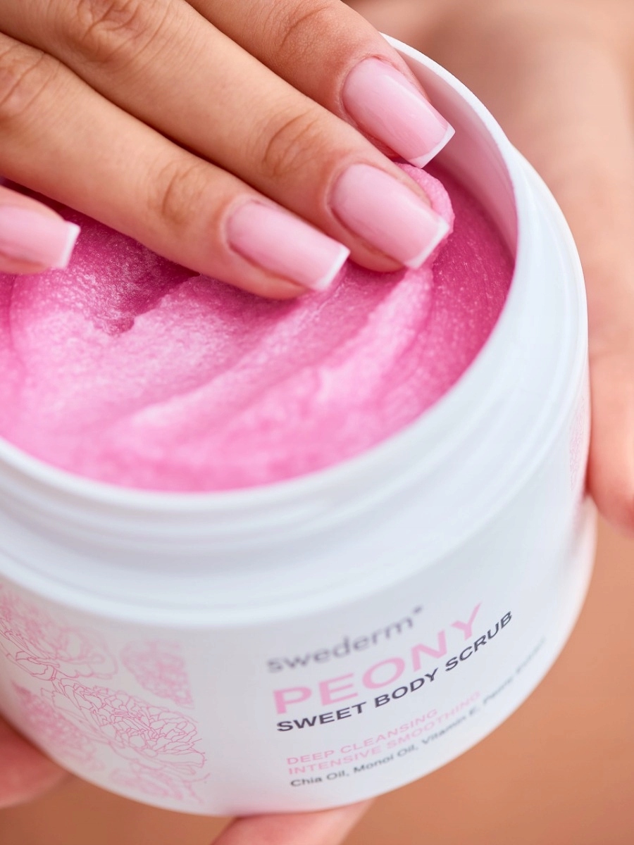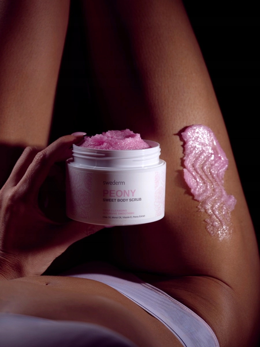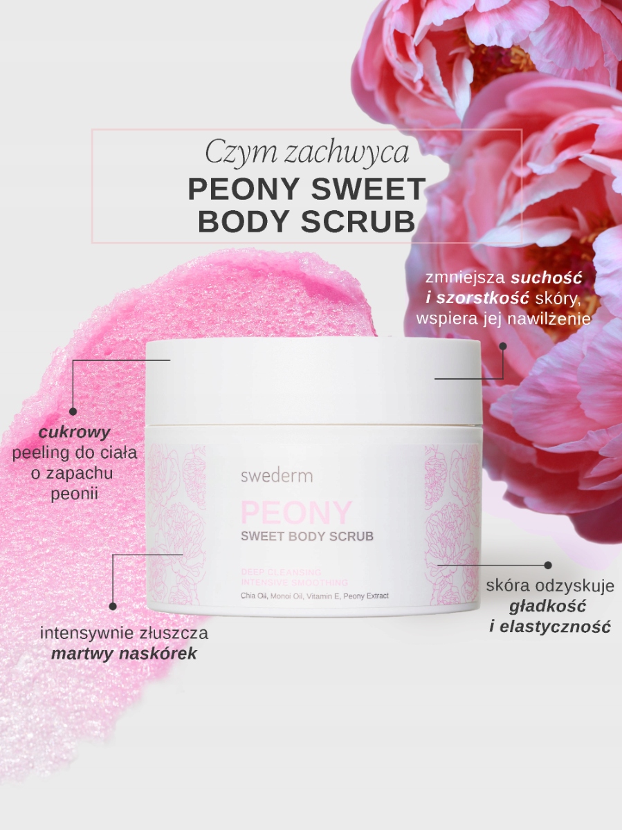 Скраб солодкого тіла - це цукрове тіло, що лущиться з півонії, збагачена чіа -олією, олією моно і вітаміну Е . Інтенсивно відлущує мертву шкіру, допомагає відновити м'якість шкіри, підтримує її гідратацію. Готує шкіру до подальшого догляду. Після масажу шкіра відновлює свою гладкість і еластичність, і її стан покращується.