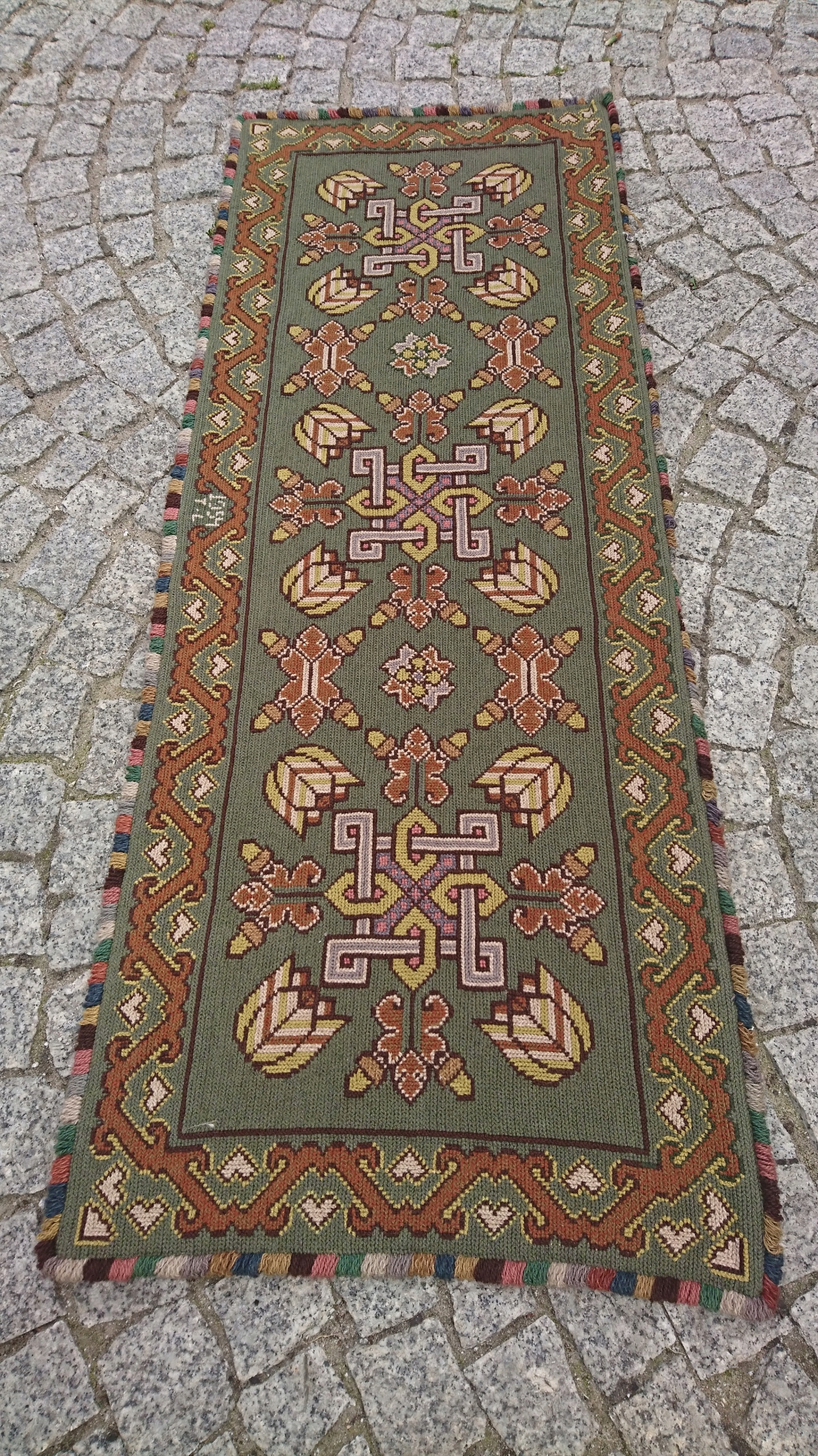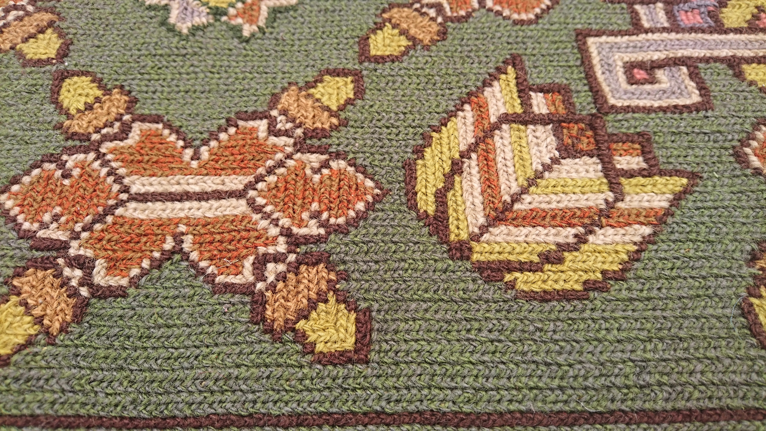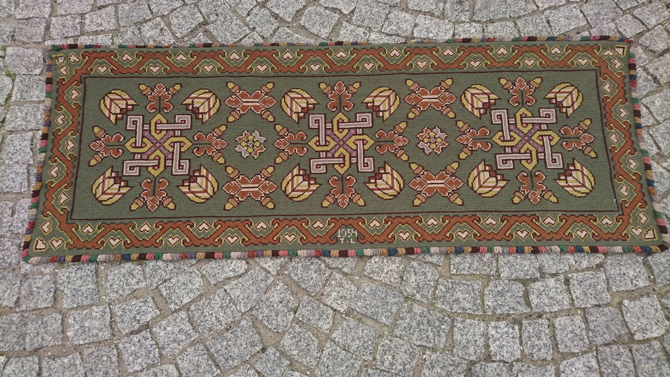 Шведський килим із підписом 1950-х рр. Надзвичайно точно вишитий із вовни найвищої якості. Характеризується компактним, приємним на дотик, щільним плетінням і красивими кольорами та візерунками. Килим однобічний, типу скумпії, з вшитим по довгому краю металевим карнизом. Він у дуже хорошому стані.