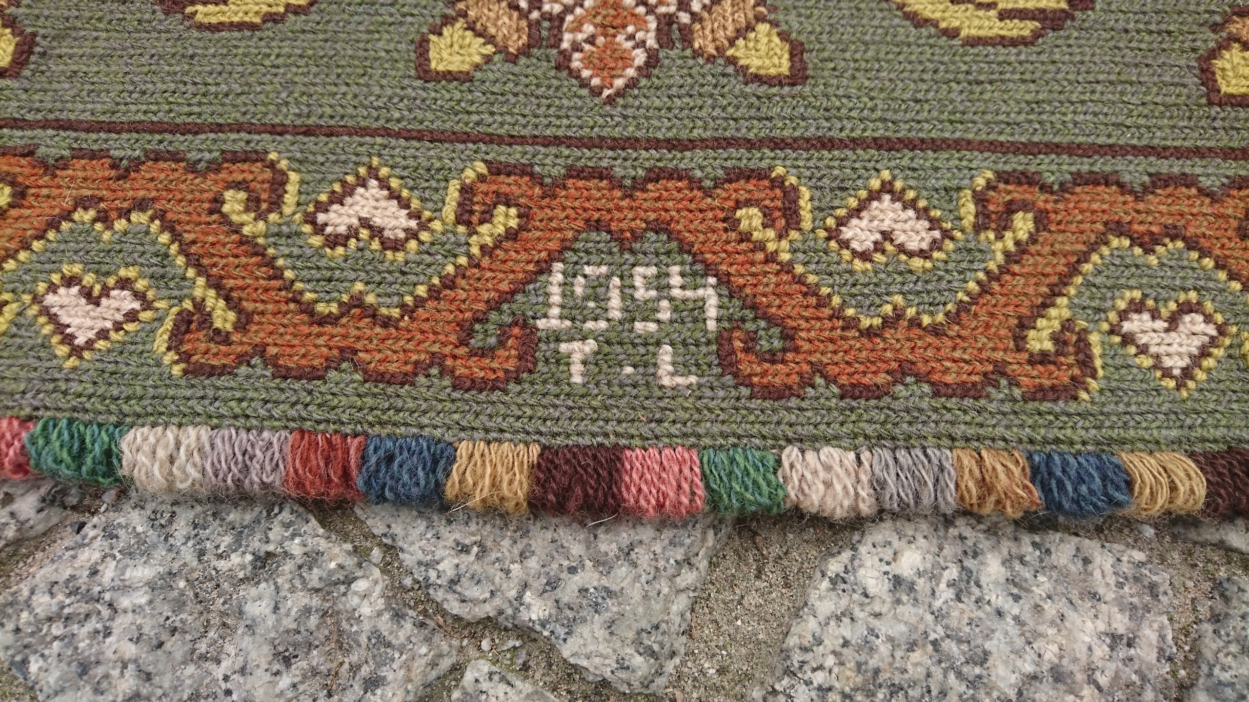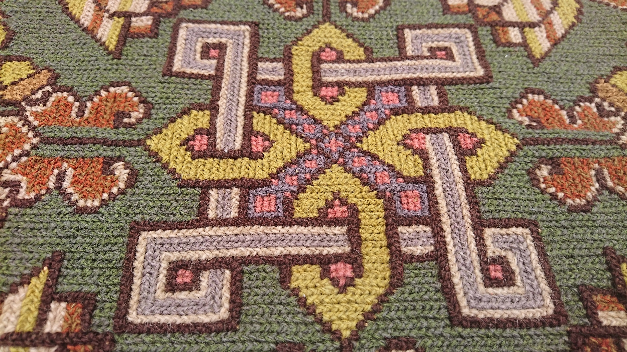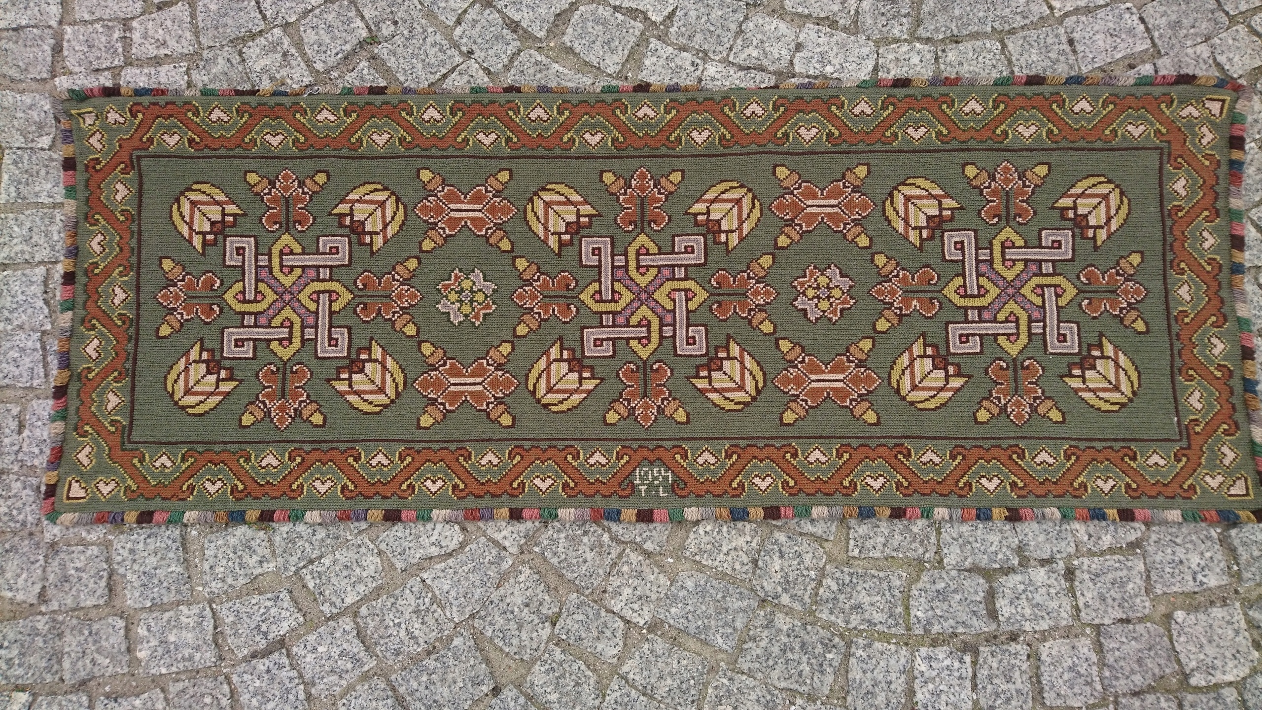 Шведський килим із підписом 1950-х рр. Надзвичайно точно вишитий із вовни найвищої якості. Характеризується компактним, приємним на дотик, щільним плетінням і красивими кольорами та візерунками. Килим однобічний, типу скумпії, з вшитим по довгому краю металевим карнизом. Він у дуже хорошому стані.
