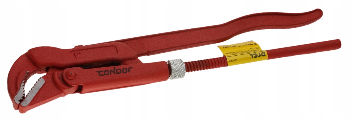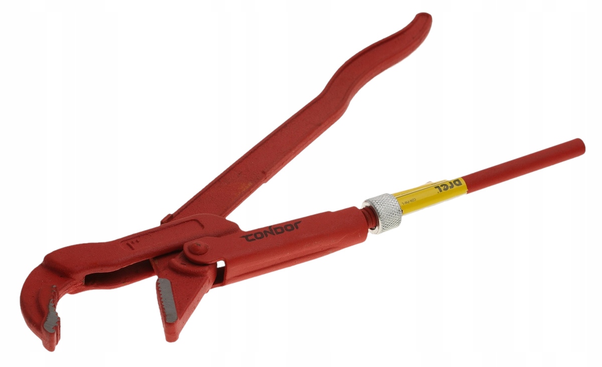 Гайковий ключ має губки, зігнуті під кутом 45°, з додатково загартованими зубами, встановленими в протилежних напрямках.